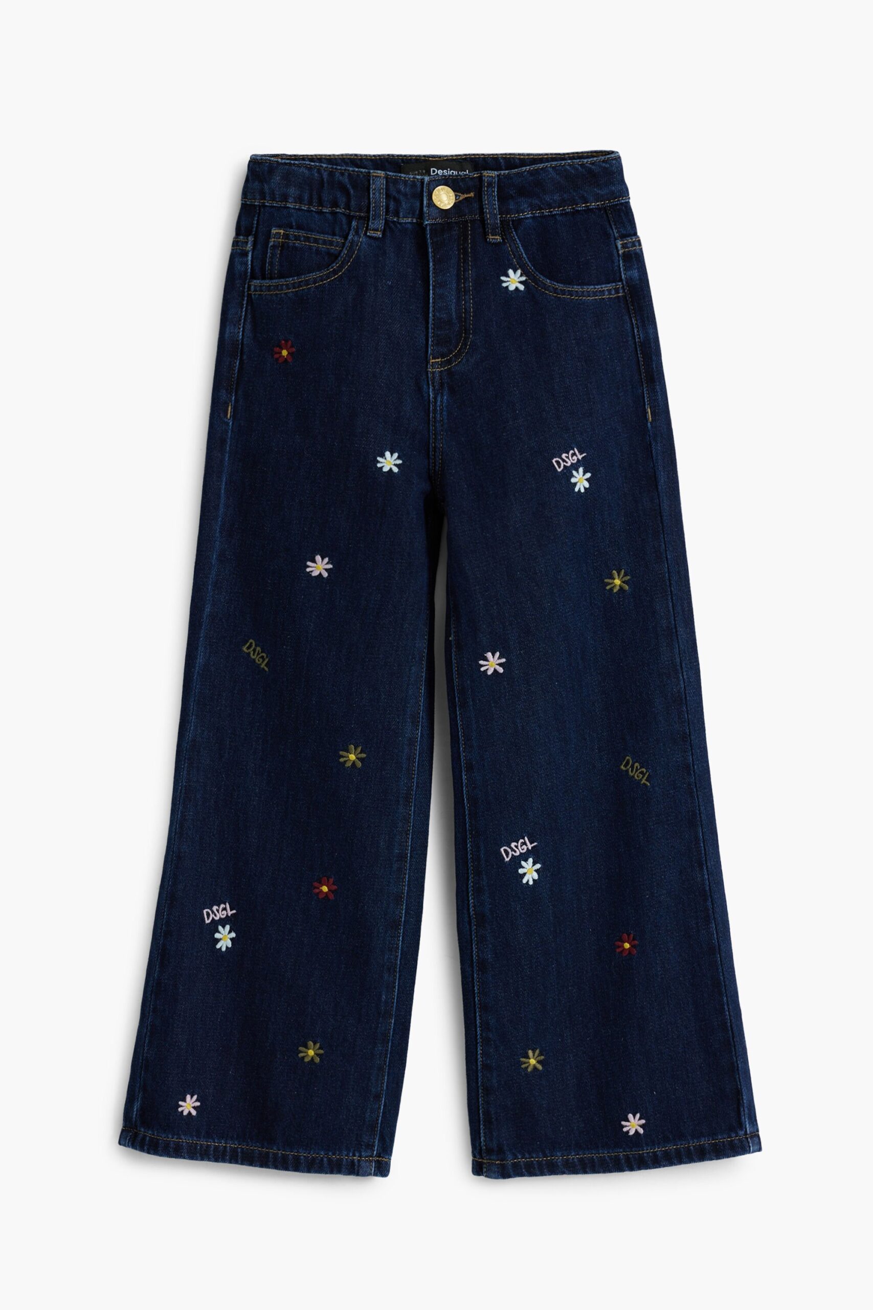 Lange jeansbroek, Wide Leg-stijl, met kleine geborduurde madeliefjes en logo en ritssluiting met knoop.