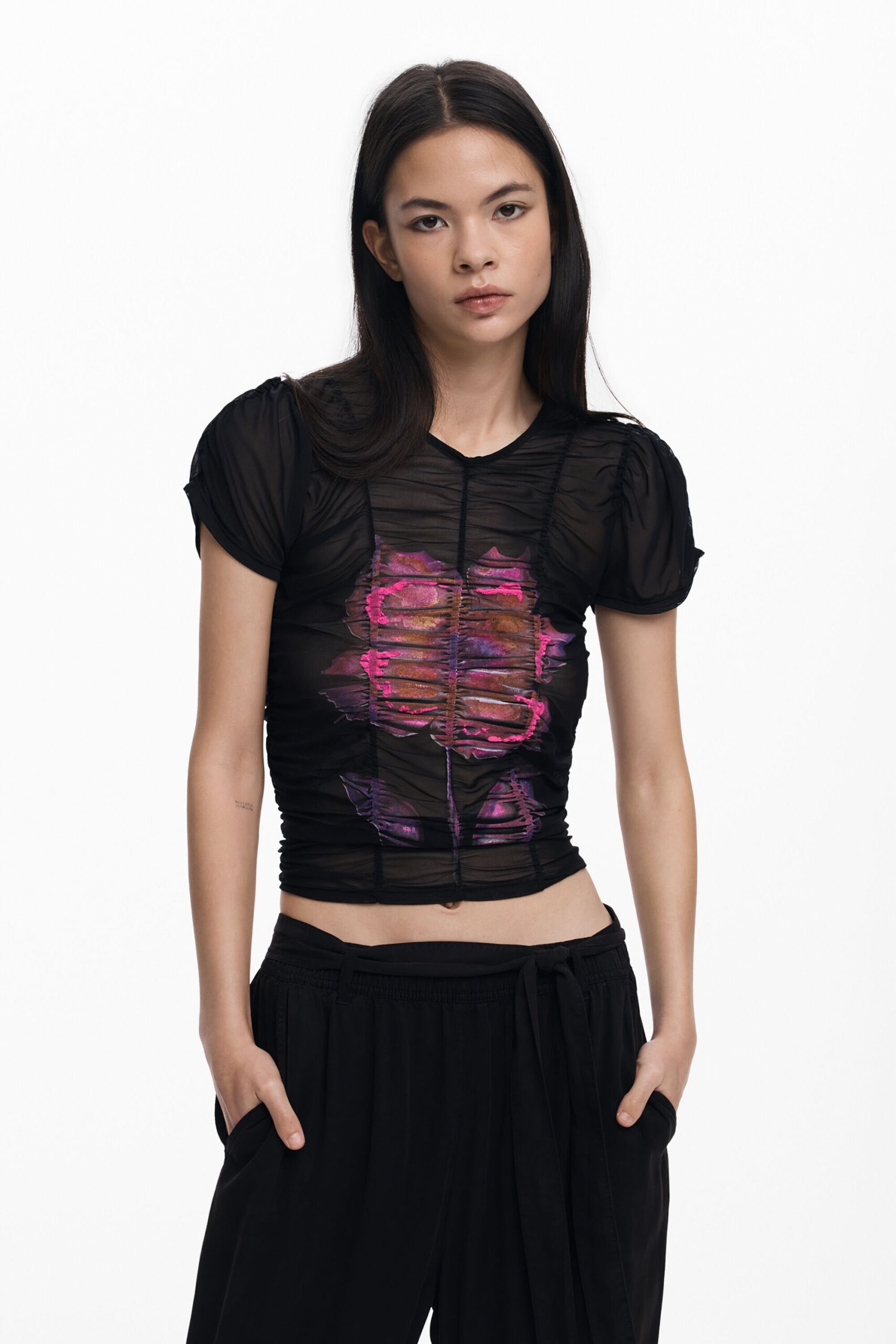 T-shirt met korte mouwen van semi-transparante stof met een grote bloemprint op de voorkant.