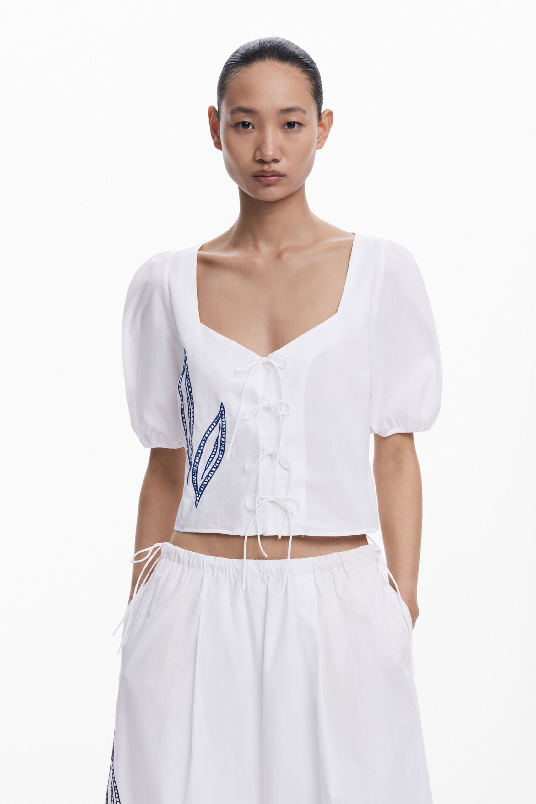 Korte mouw blouse in ballonstijl, effen kleur, met geborduurde bladdetails in contrasterend garen en strikjes aan de voorkant.