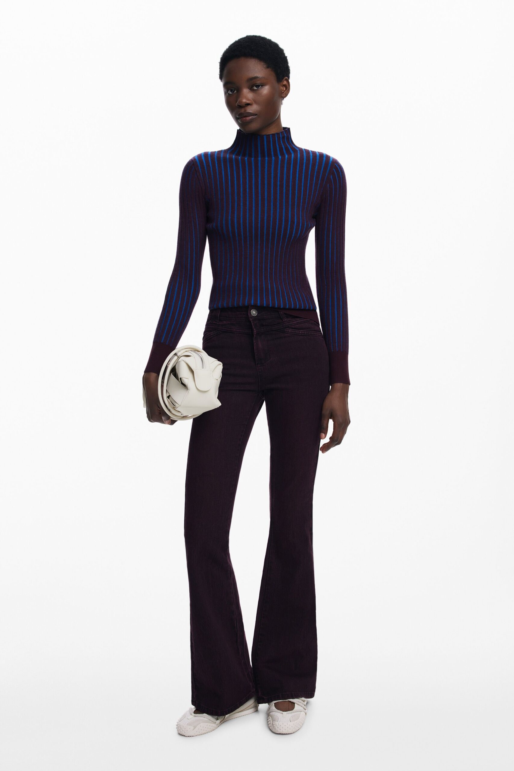 Lange spijkerbroek met flare-afwerking, stiksel detail in de taille en in donker gewassen bordeauxrood.