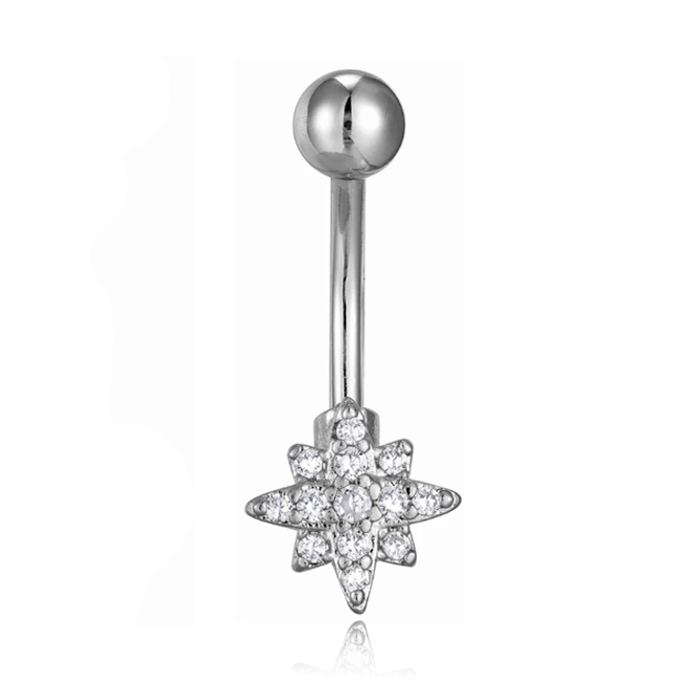 De onderkant van de piercing is gevormd als een ster, en opvallend versierd met kleine strass steentjes. Aan de bovenkant van de piercing een bolletje van 5mm.