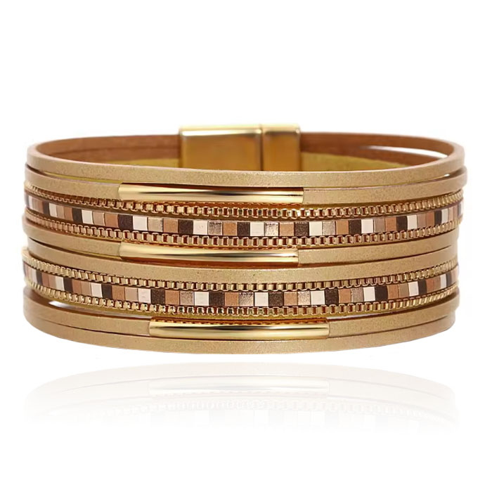 Deze champagnekleurige Deja Jewels armband met goudkleurige details is een echte eyecatcher. Het mozaïekdesign met lichte en donkere blokjes geeft een modern contrast. Door de meerlaagse structuur oogt het sieraad rijk en stijlvol. Gemaakt van imitatieleer en voorzien van een praktische magneetsluiting. Een armband die perfect aansluit bij feestelijke en elegante outfits.