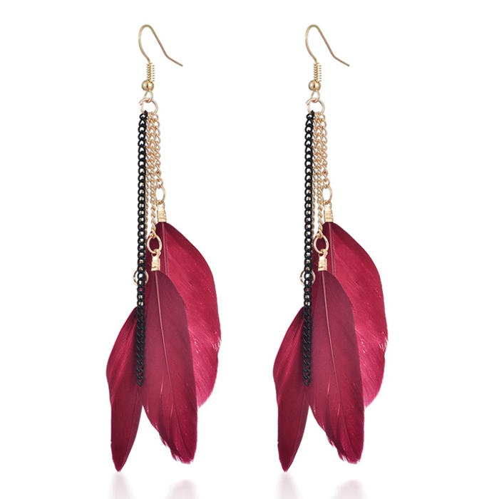 Goudkleurige oorbellen van het merk Deja Jewels voor dames. De oorhangers bestaan uit donker rode veren bevestigd aan losse kettinkjes.