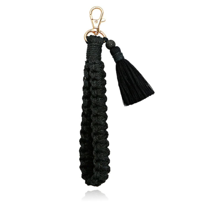 Deze macramé gevlochten sleutelhanger is gemaakt van duurzaam katoen in de kleur zwart, en voorzien van een lava steen kraal en kwastje in dezelfde kleur.