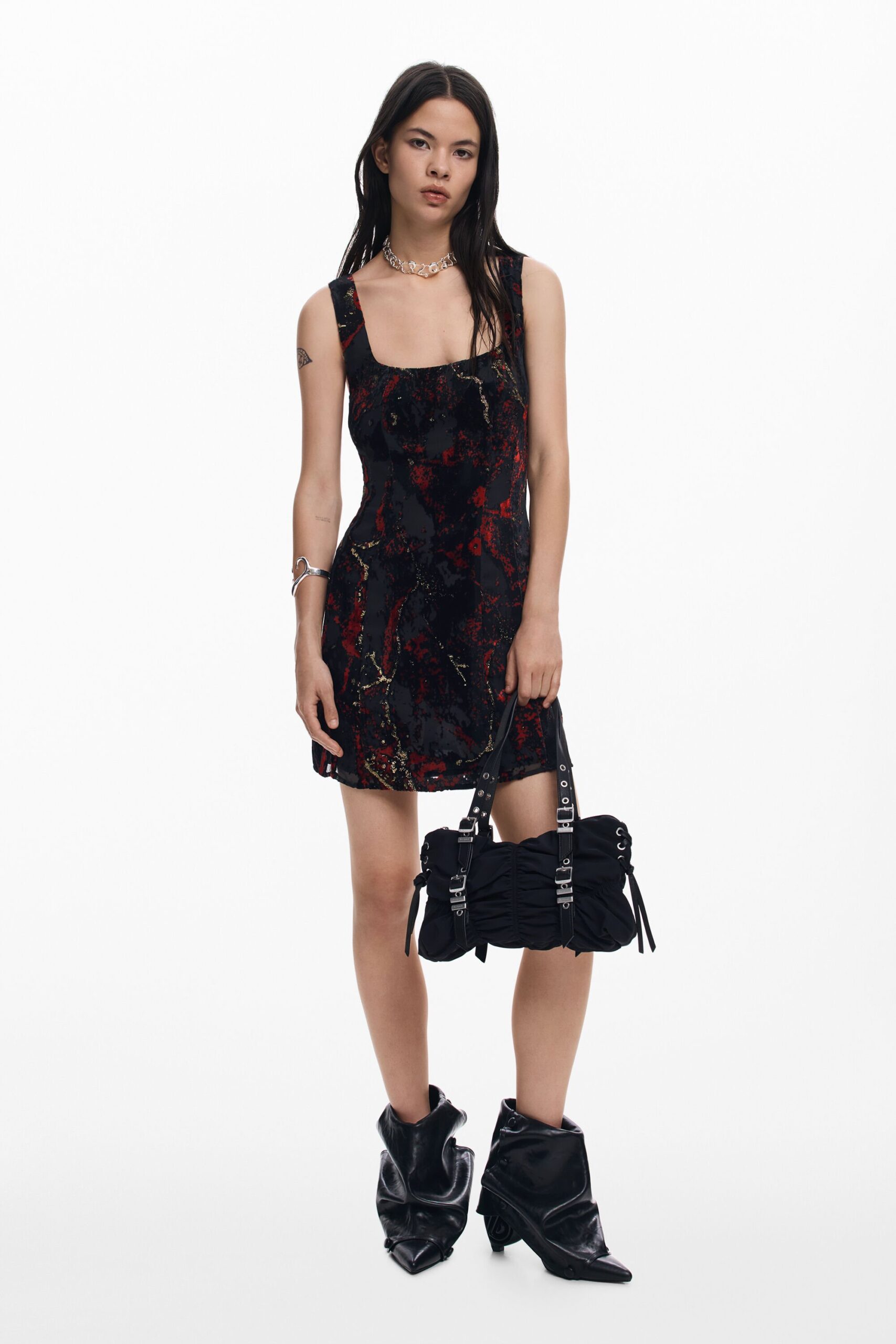 Jurk met brede band in devoré stof met abstracte print en fluweelachtige afwerking.
