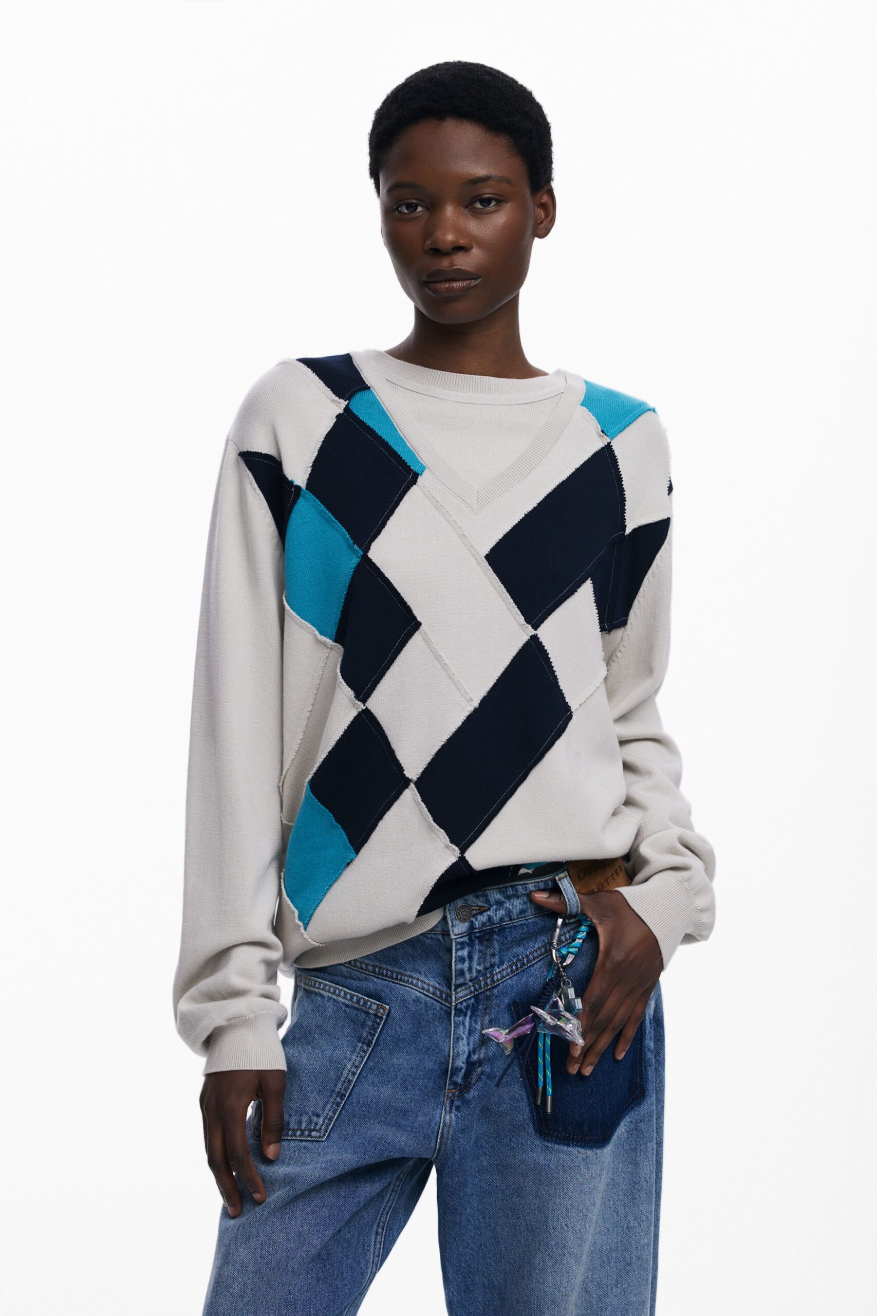 Fijngebreide trui van katoen, met dubbele ronde en V-hals, ontwerp van de print met details van ruiten langs de rand en geribbelde afwerking bij de manchetten en taille.