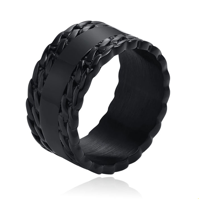De kleur van de ring is zwart, deze ring is perfect voor degene die op zoek zijn naar een brede en opvallende ring.