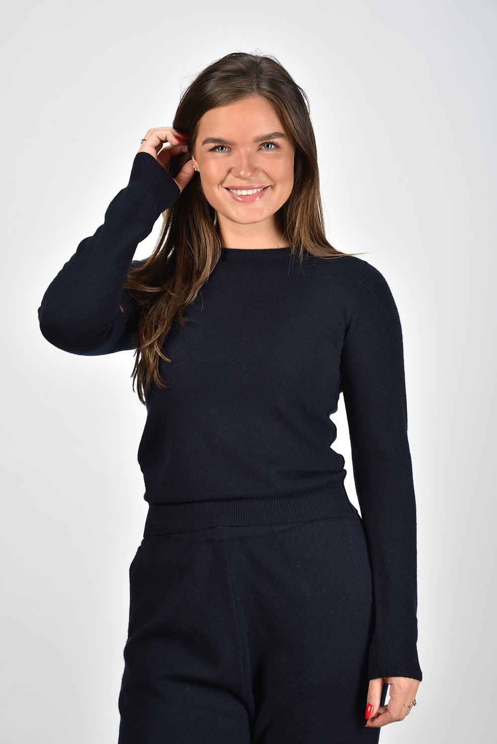 De Extreme Cashmere trui, model Body, in de kleur navy. Met zijn zachte textuur en luxueuze uitstraling voelt deze trui heerlijk aan, de kleur zorgt er voor dat je dit item met alles kan combineren. Of je het nu draagt met een casual jeans voor een ontspannen look of met de bijpassende broek voor een meer formele gelegenheid, de Extreme Cashmere trui voegt een vleugje luxe en stijl toe aan elke outfit. Model is 1,73 m, heeft maat M en draagt maat One Size.
