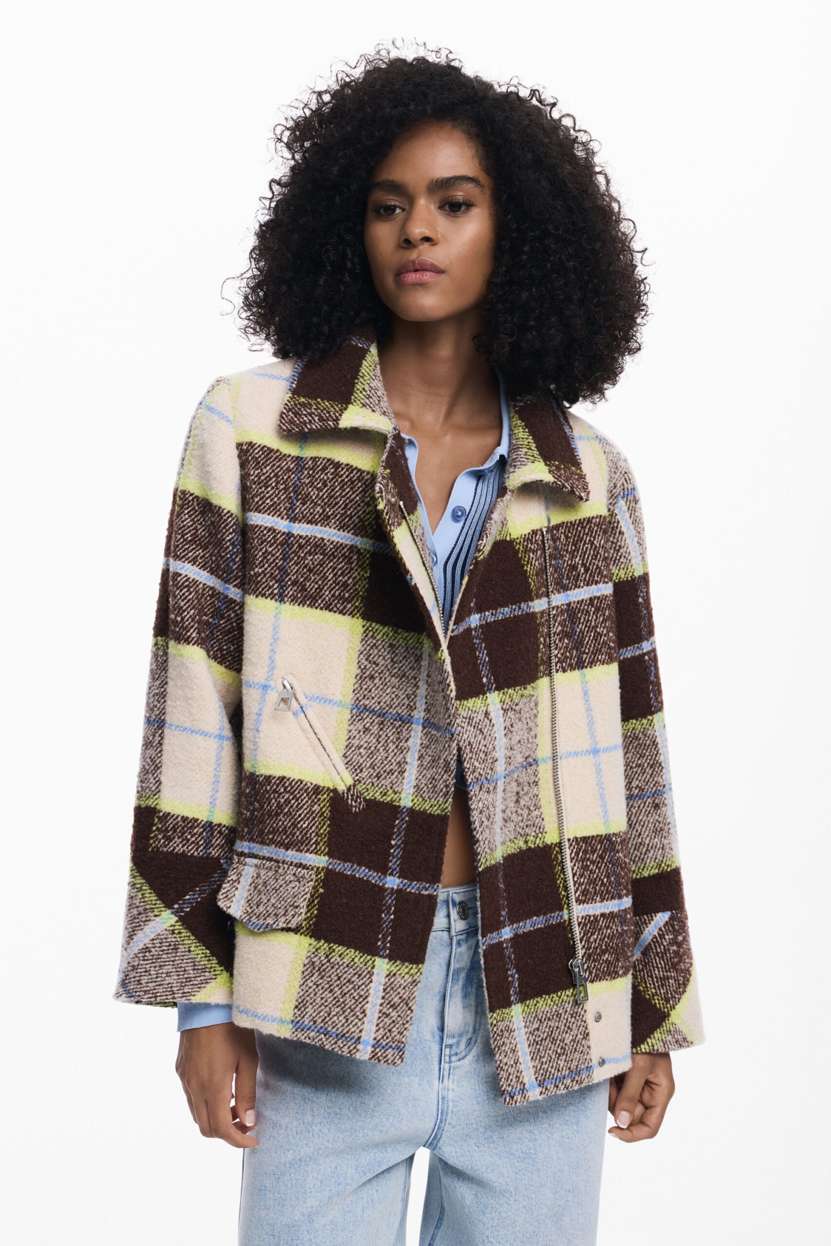 Korte double-breasted jas, met knoopsluiting, voorzakken, V-hals en ruitpatroon in beige tinten.