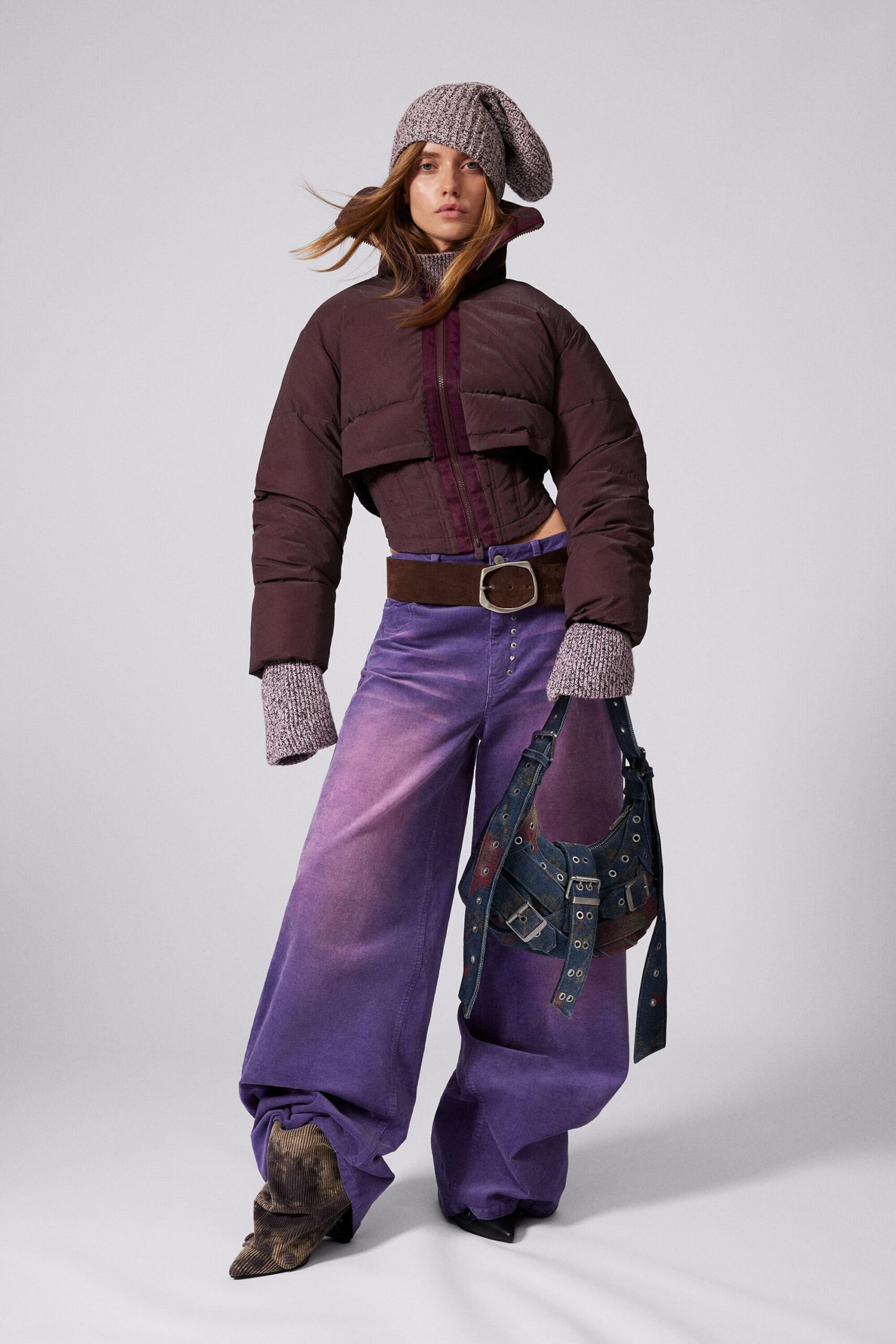 Korte gewatteerde jas met verstelbare taille in korsetstijl, reverskraag en contrasterende kleuraccenten.