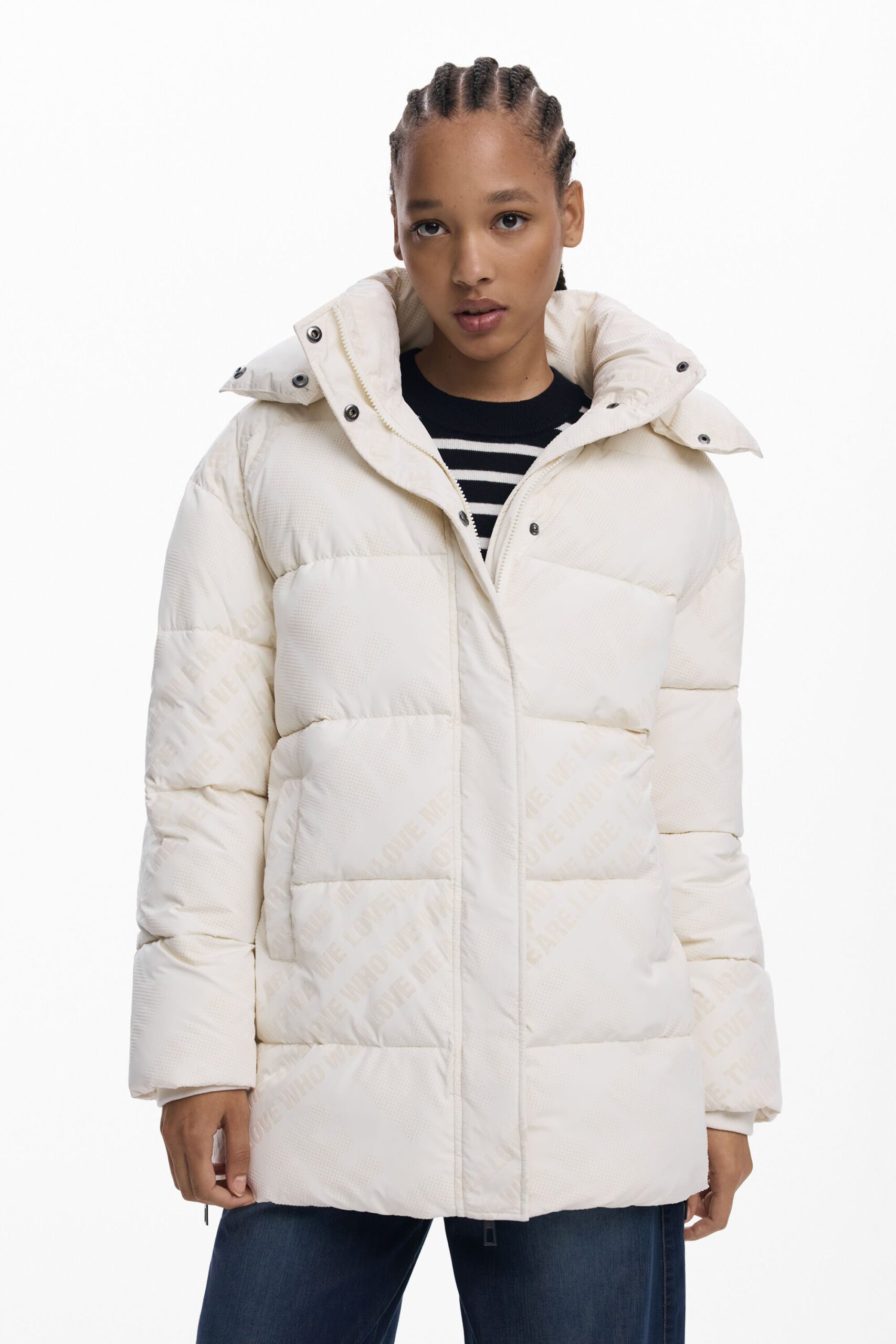 Lange gewatteerde jas met voorzakken en afneembare capuchon in effen kleur met flockdetails.