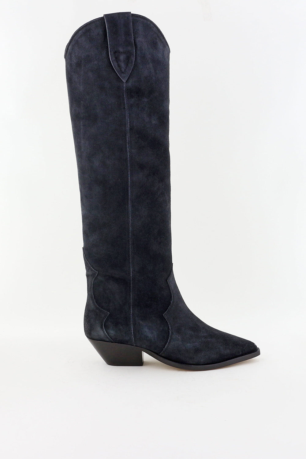 Prachtige suede laars van Isabel Marant, model Denvee, in de kleur faded black. De laars heeft een hakhoogte van 4 cm. Combineer de laars met een jurkje van Isabel Marant.