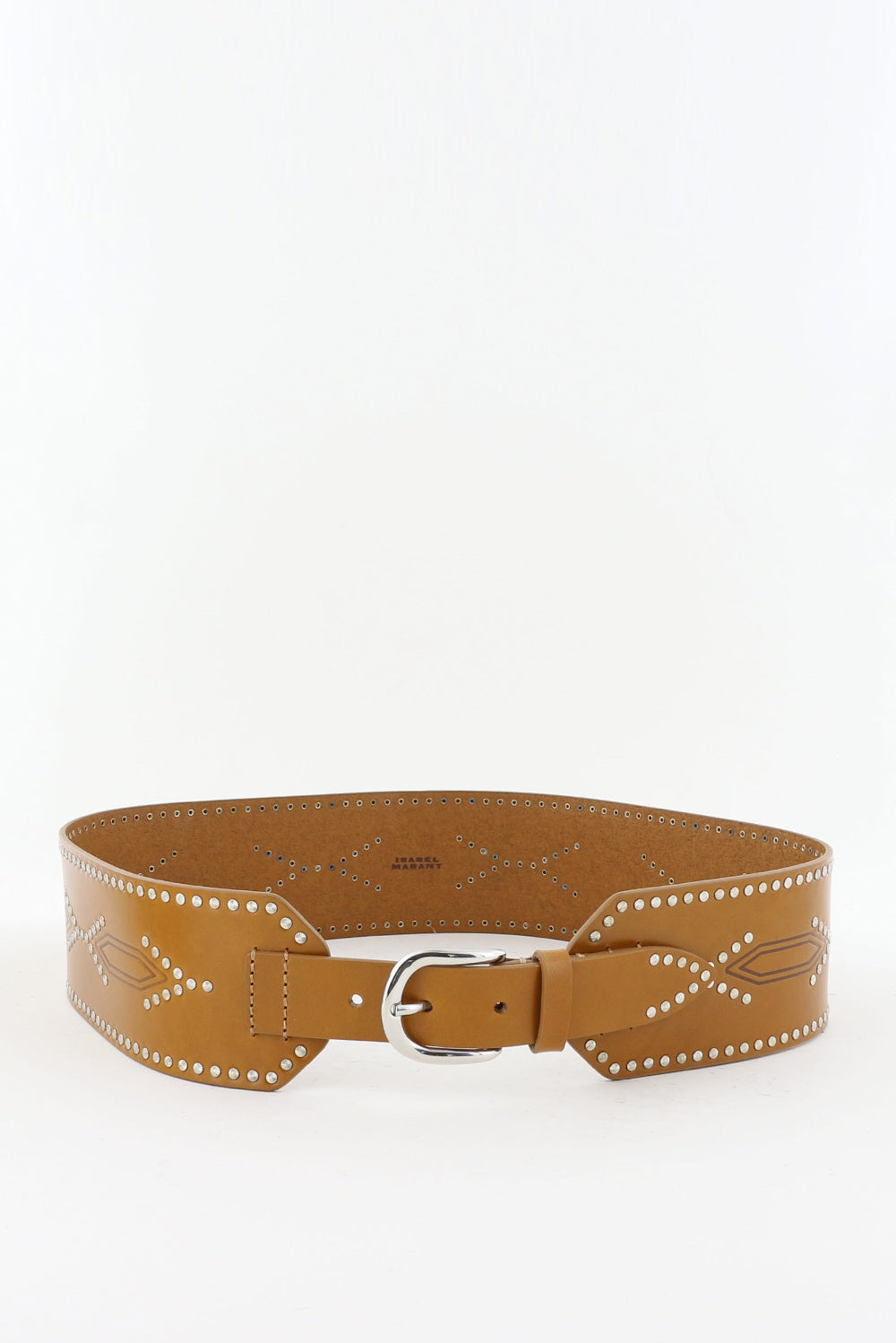 Prachtige riem van het merk Isabel Marant, model Telma, in de kleur cognac. Deze riem combineert moeiteloos moderniteit met tijdloze klasse. De chalk-kleurige leren band straalt een ingetogen luxe uit, terwijl de zilverkleurige gesp én studs een vleugje glans en verfijning toevoegen. De breedte van de riem is 7 cm.
