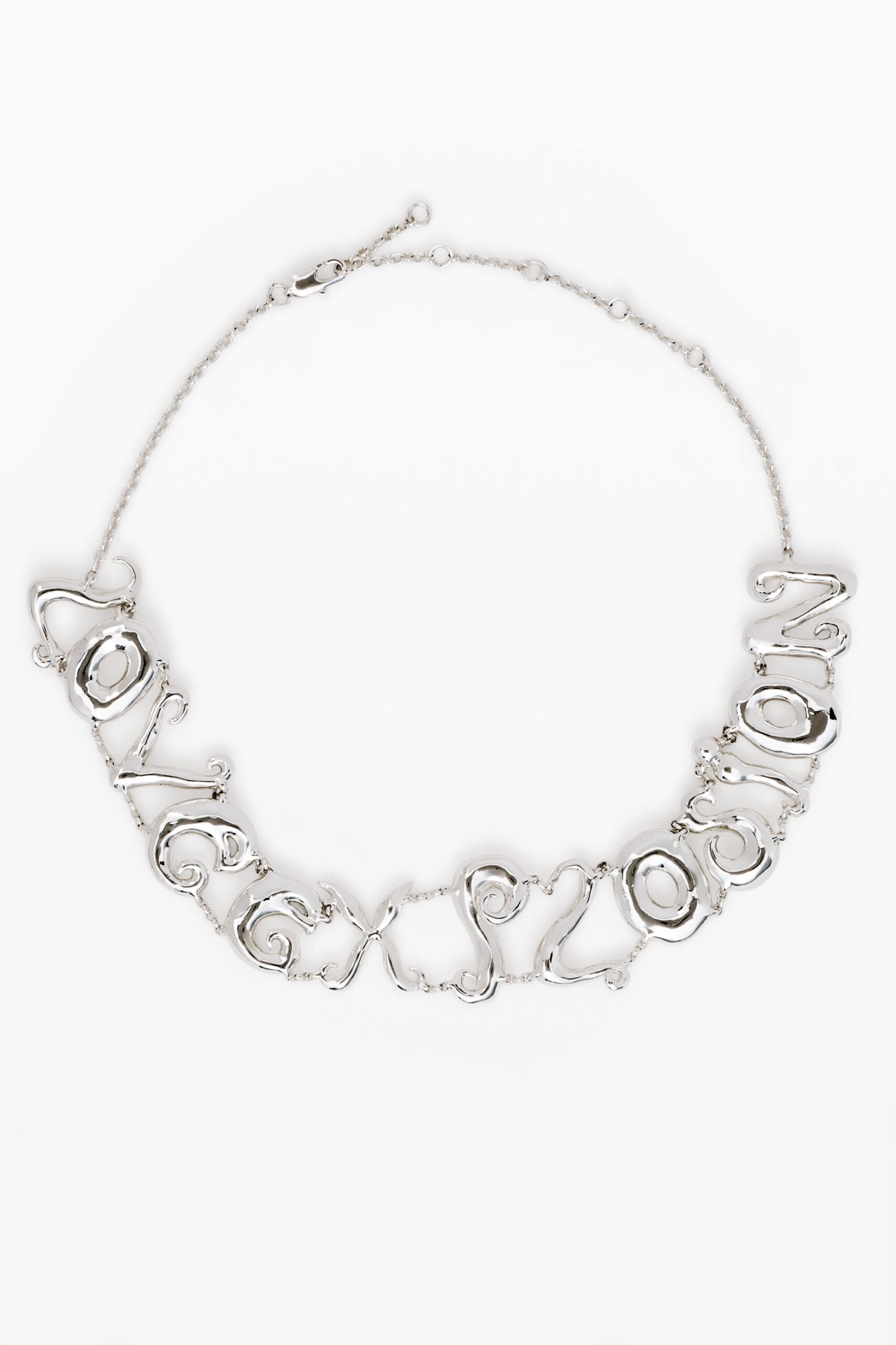 Halsketting bestaande uit een fijne ketting met letterbedels en karabijnsluiting, gemaakt van metaal met een zilverkleurige afwerking.