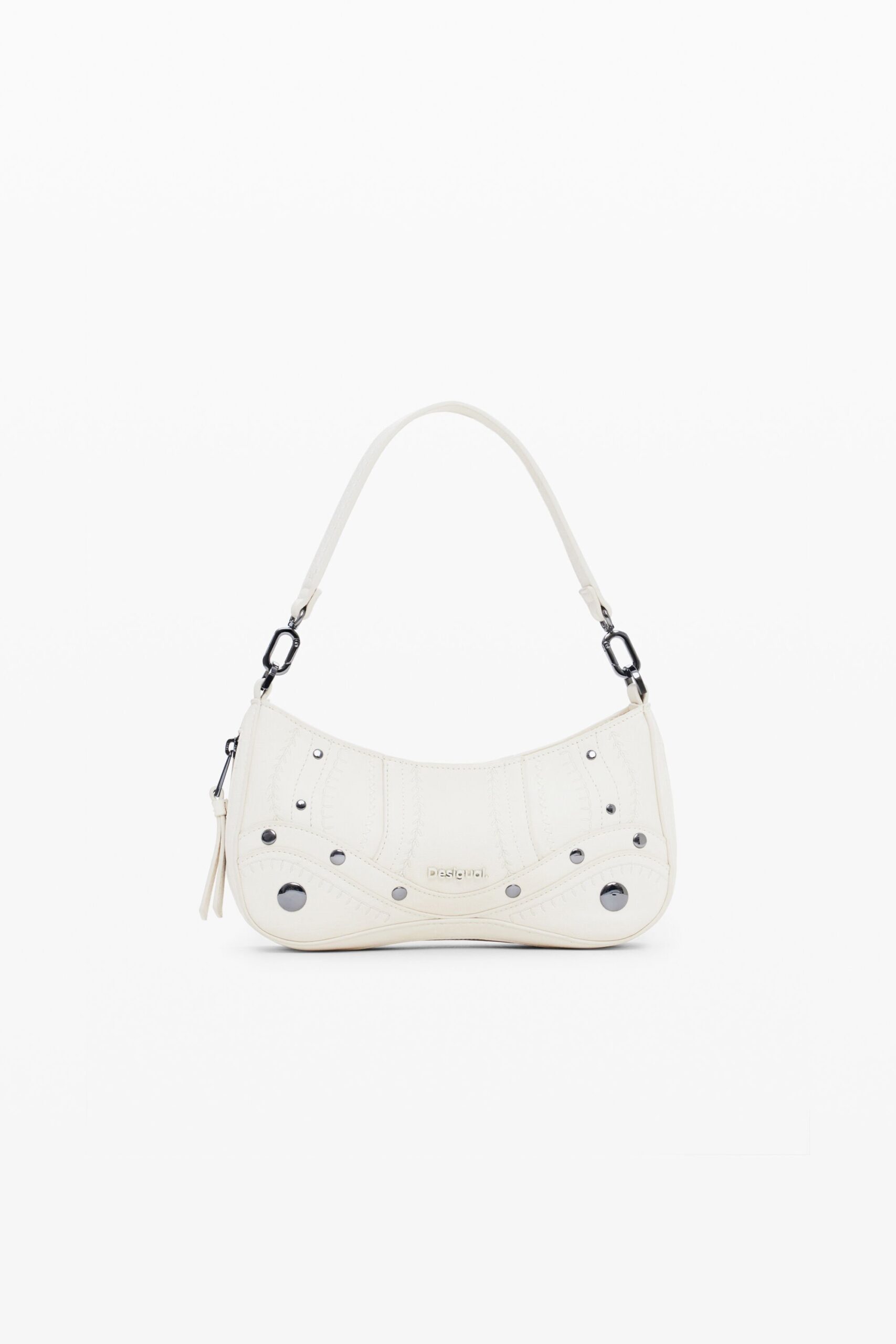Kleine tas van stof met leerlook, ritssluiting en details van borduursels en metalen applicaties.