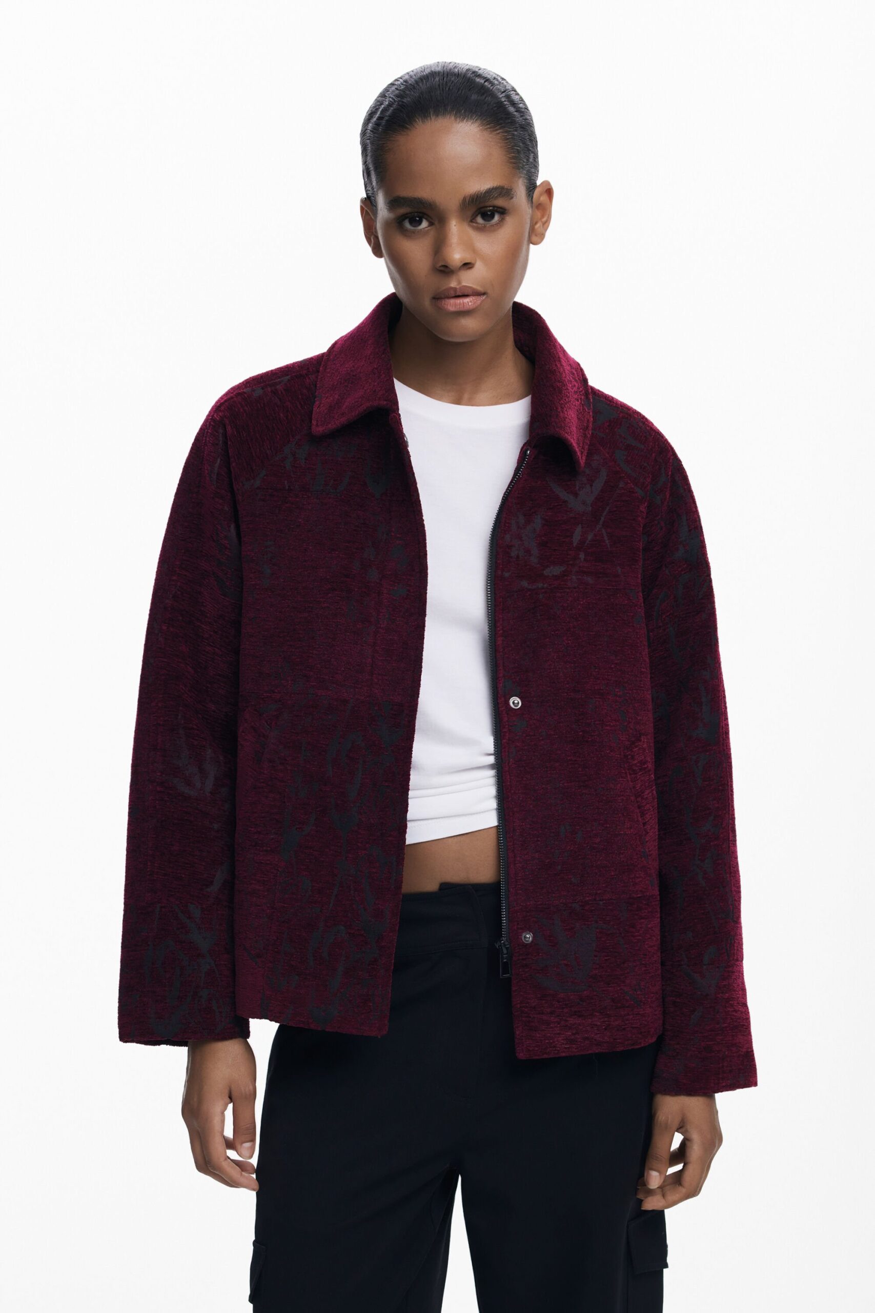 Korte jas met textuur, ritssluiting en knopen, voorzakken en overhemdkraag.