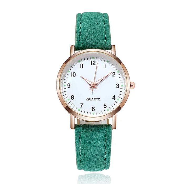 Dit dameshorloge van LGT JWLS combineert eenvoud met verfijning. De metalen behuizing, voorzien van een roségouden coating, straalt elegantie uit, terwijl de zachte lederen band in een levendige groene kleur een vleugje frisheid toevoegt aan het geheel. De witte wijzerplaat met zwarte uuraanduiding zorgt voor een duidelijke weergave van de tijd, terwijl de lichtgevende wijzers ervoor zorgen dat deze altijd goed leesbaar zijn, zelfs in het donker. Dit horloge is de perfecte keuze voor vrouwen die op zoek zijn naar een tijdloos en veelzijdig accessoire dat zowel stijlvol als functioneel is.