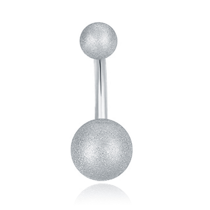 De piercing bestaat uit een onderste bol van 10mm, afgewerkt met een matte finish. En aan de bovenkant een kleinere bol, ook met een matte afwerking.