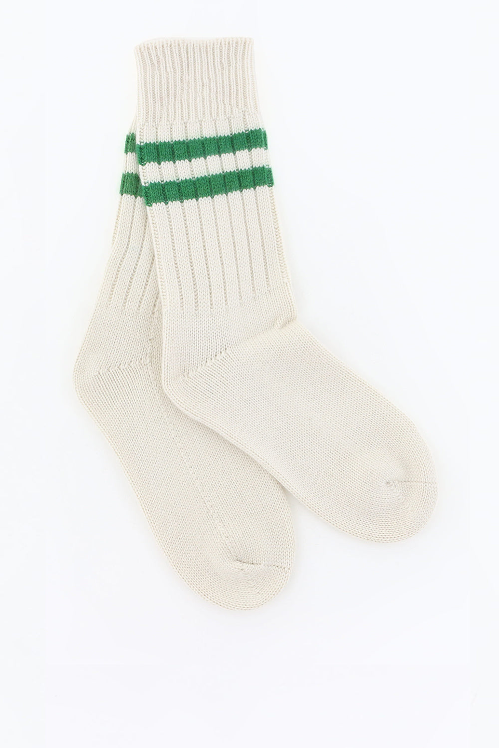 Deze prachtige zachte sokken van Mell O Cashmere zijn gemaakt van 100% cashmere. Draag deze te leuke sokken in je favoriete sneakers. De sokken zijn wit met sportieve groene strepen en handgemaakt in Nepal.