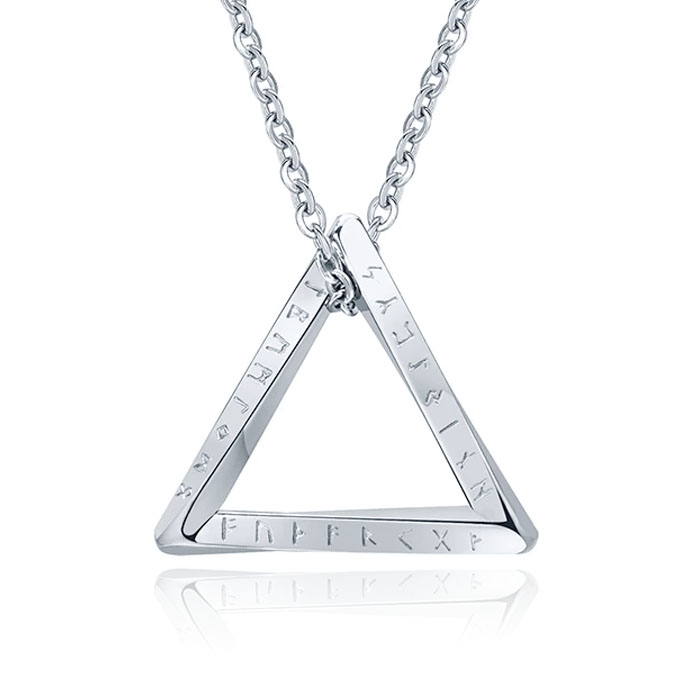 De stalen kettinghanger is driehoekig en bevat noorse symbolen, wat de ketting een uniek en krachtig uiterlijk geeft.