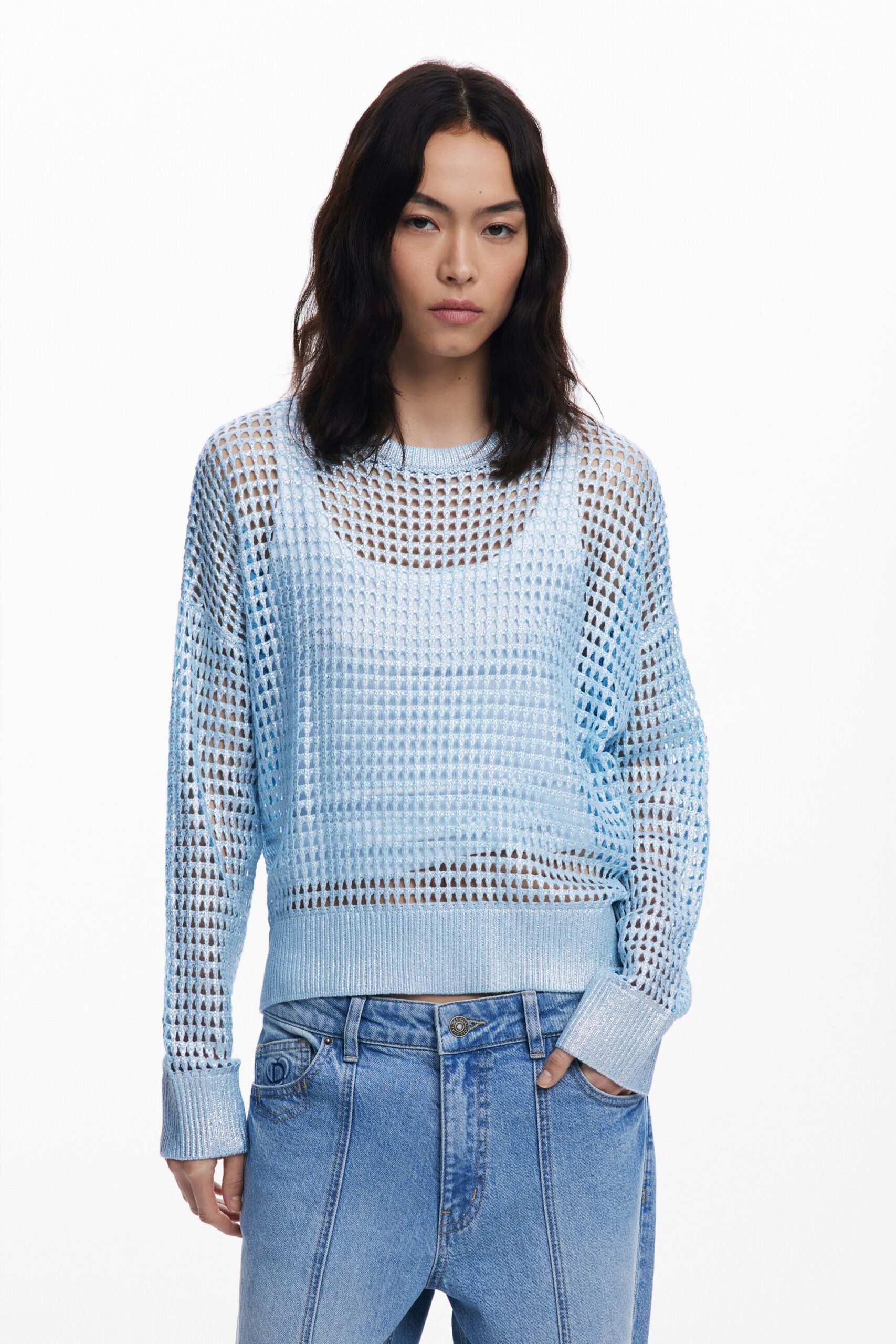 Fijne trui van opengewerkt breisel met metallic afwerking, ronde hals, lange mouwen en effen kleur.