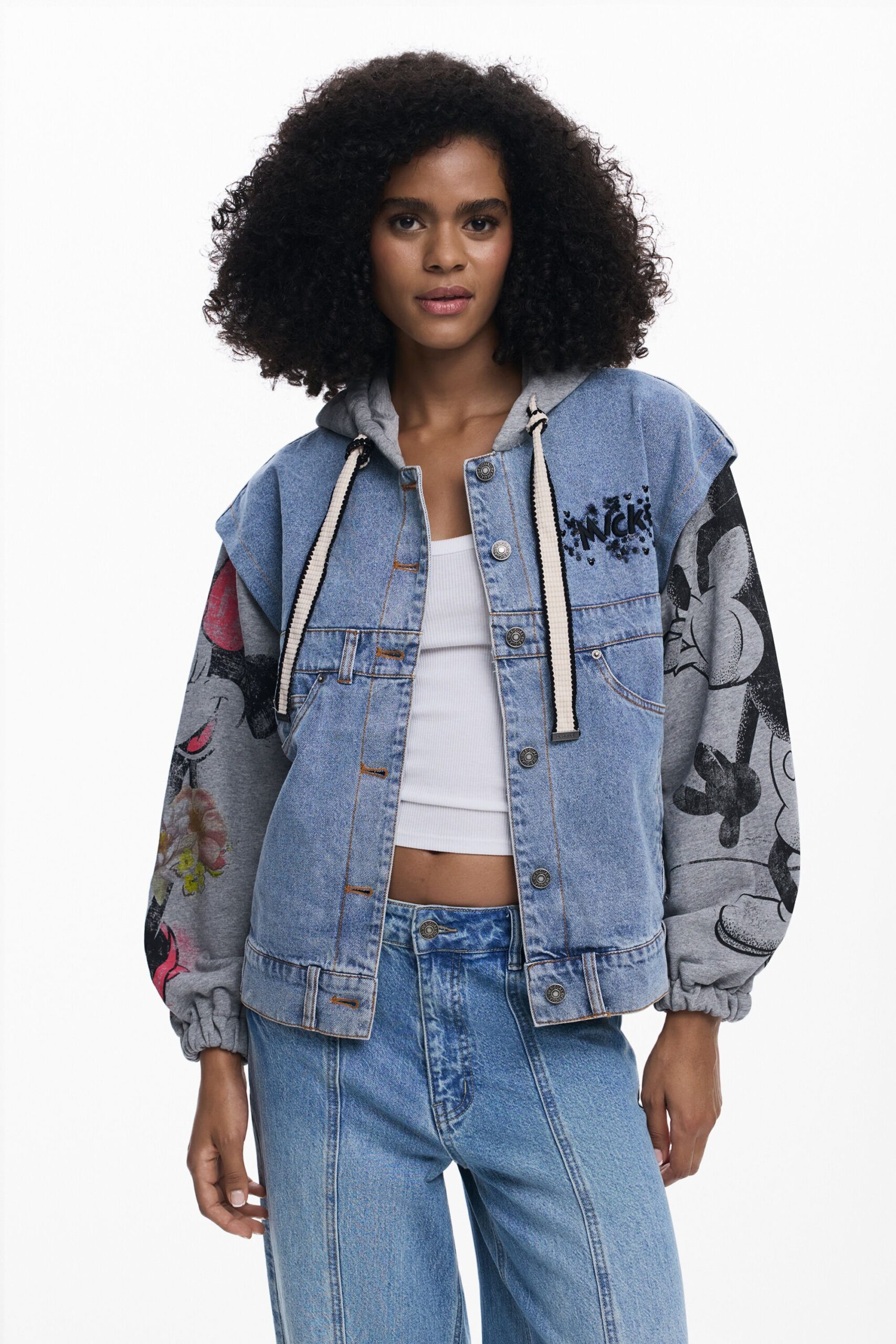 Trucker spijkerjack met details van Mickey Mouse™ en Minnie Mouse™ en mouwen en capuchon van sweatshirtstof
