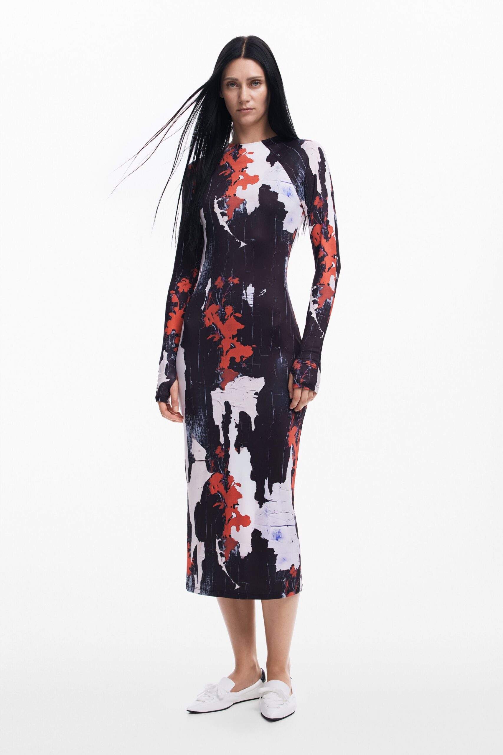 Lange mouw midi slim jurk met print ontworpen door Alphonse Maitrepierre