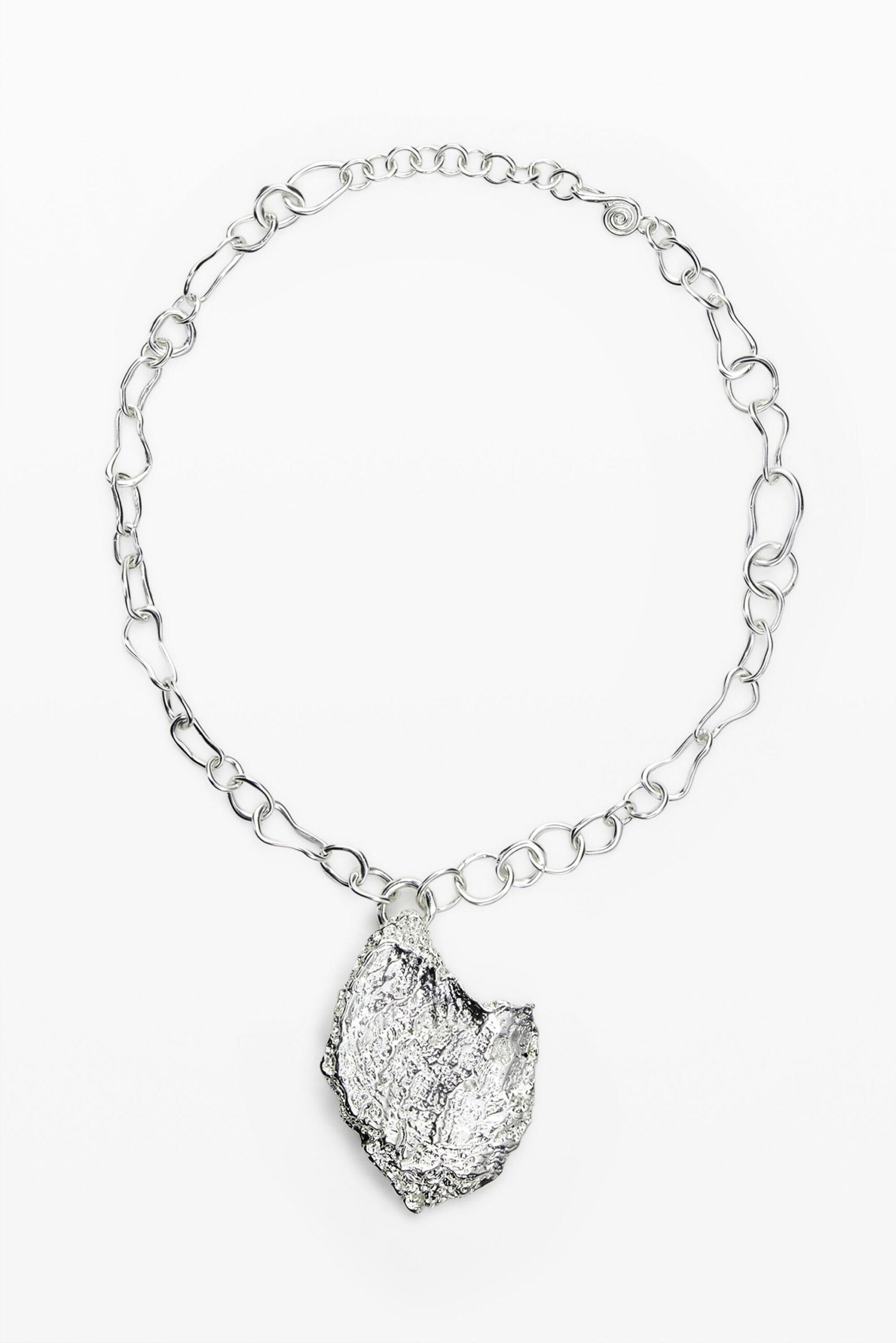 Hanger in de vorm van een zeeschelp, verzilverd met 1e wet van 3 micro inch. Het heeft een ketting en een katoenen koord die afzonderlijk of samen kunnen worden gebruikt. Collectie Zalio x Desigual; ontworpen door Gala Meyer.