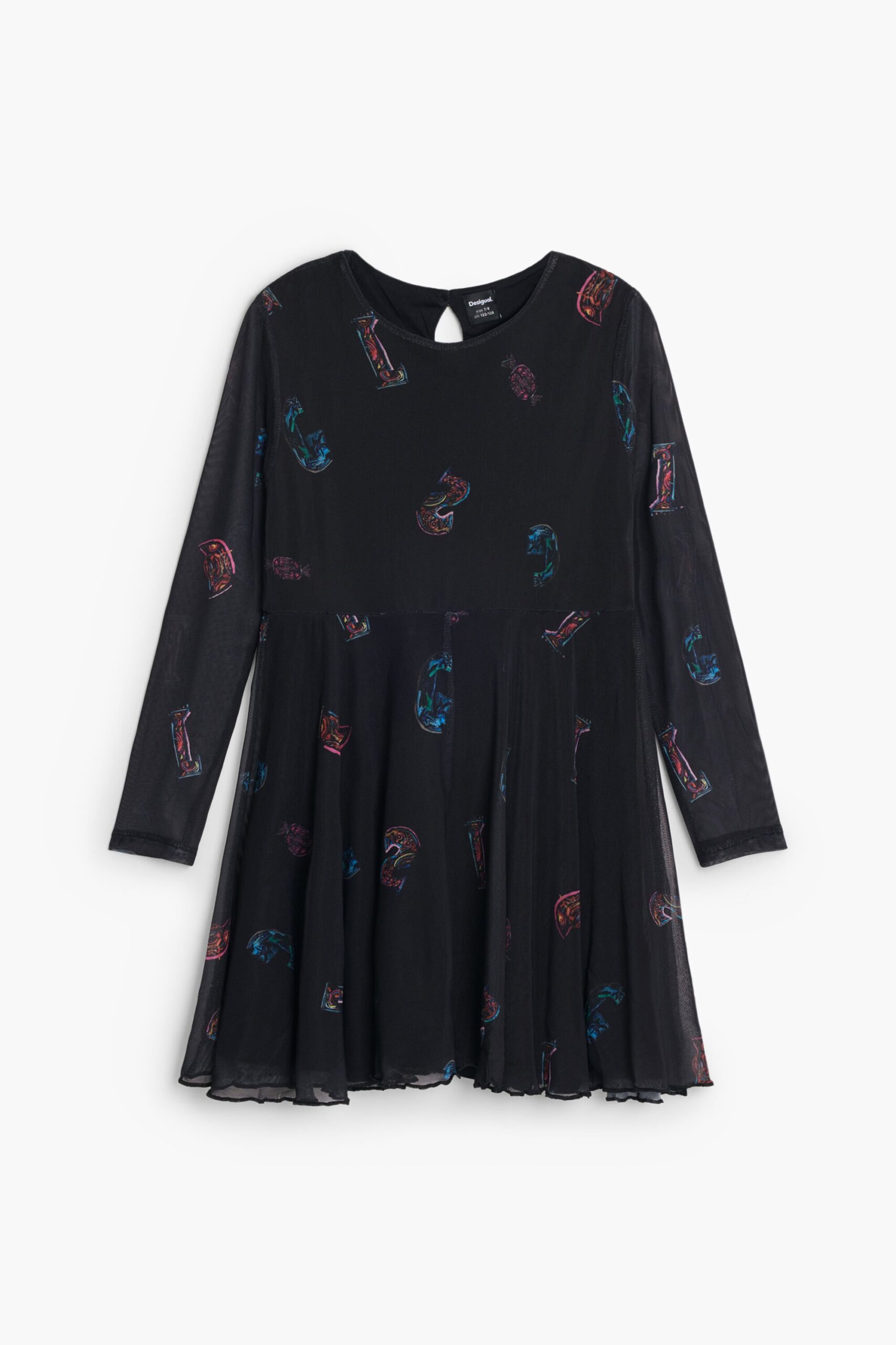 Jurk met zwarte achtergrond en abstracte letterprint.