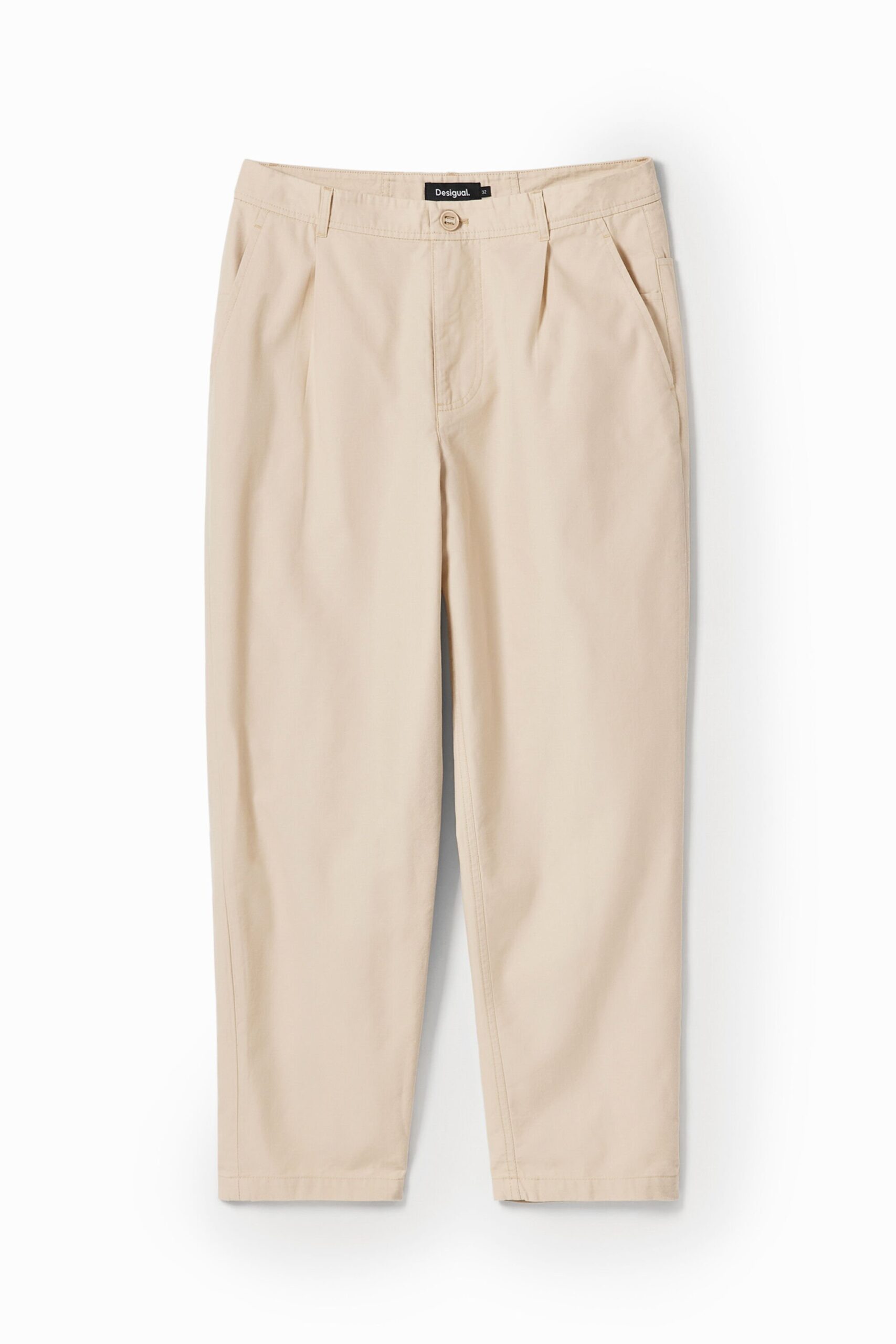 Plain chino-style trousers with darts and multiple pockets featuring a back that mimics the front.