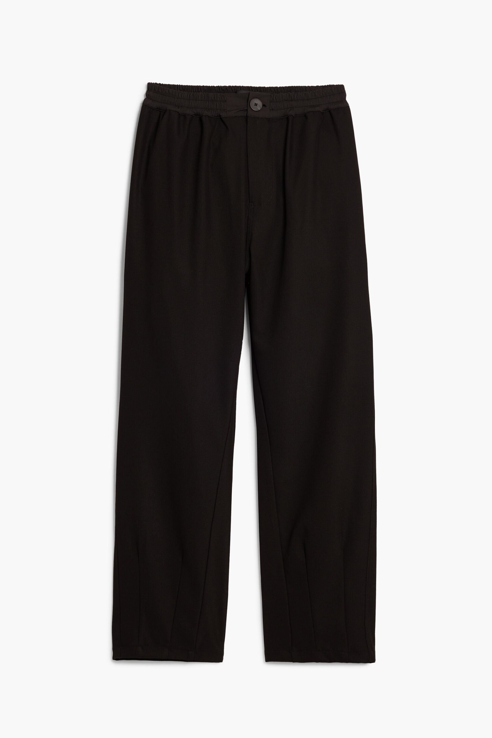 Lange broek met rechte snit, gemaakt van lichtgewicht effen stof, met trekkoorden en elastiek in de taille.