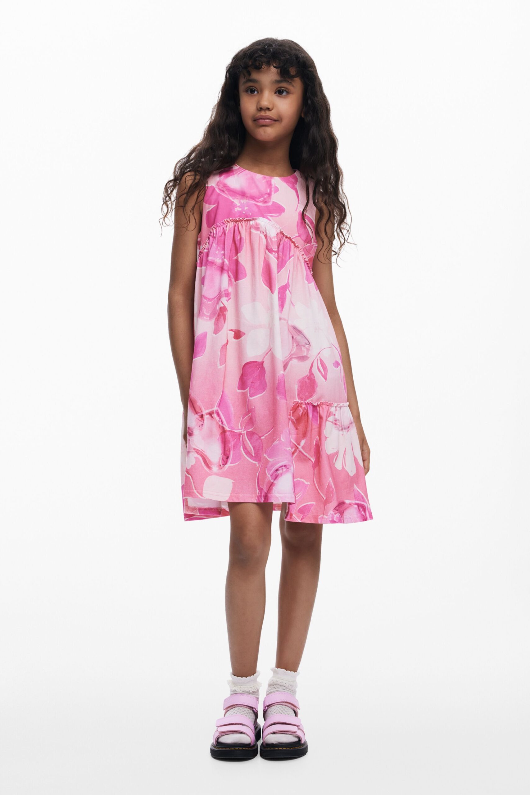Korte mouwloze jurk in A-lijn met gerimpelde boorden op de borst en zoom en digitale bloemenprint.