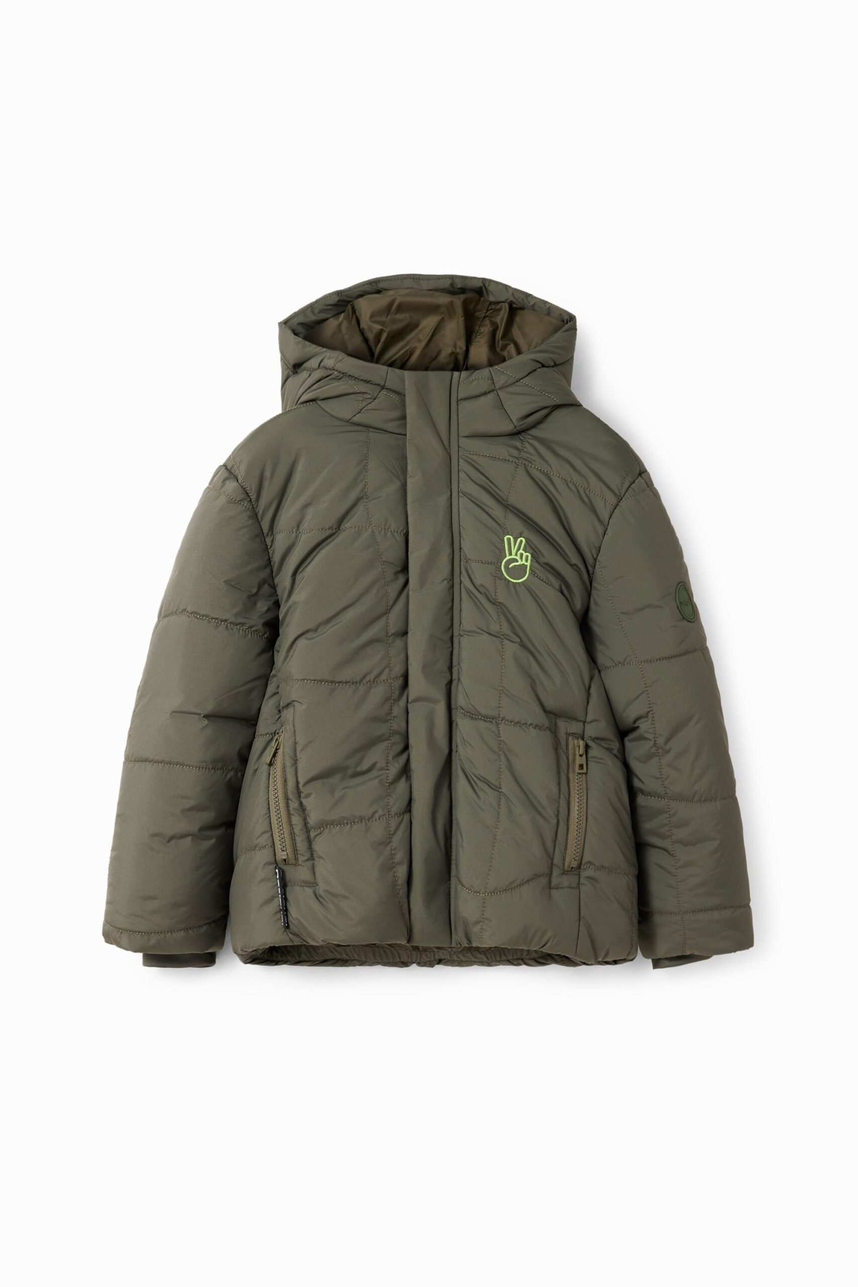 Gewatteerd jack met capuchon in een effen kleur met contrasterende borduursels op de voorkant.