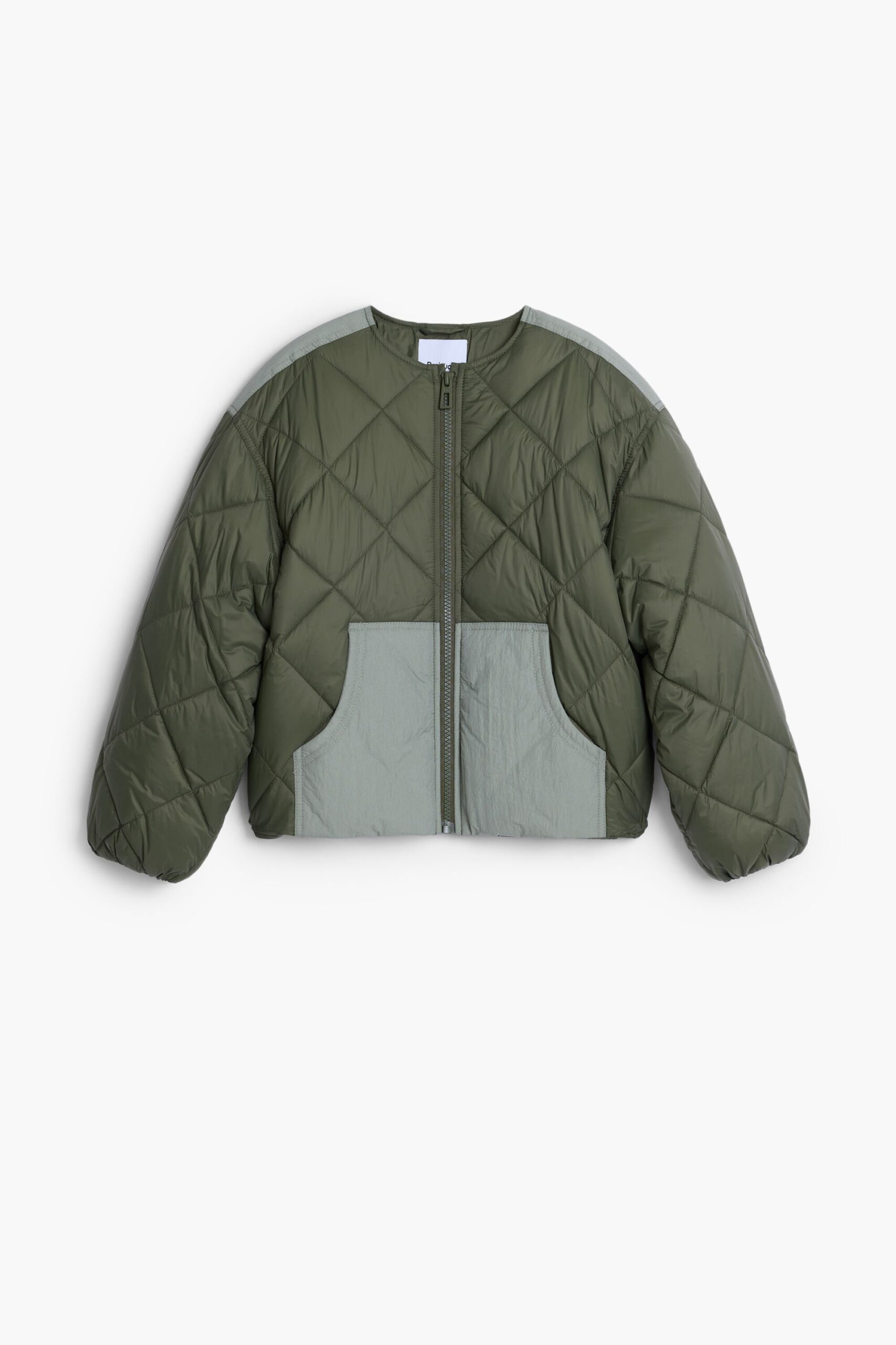 Gewatteerd nylon jasje met grote zijzakken en afgewerkt in twee gecombineerde kleuren.