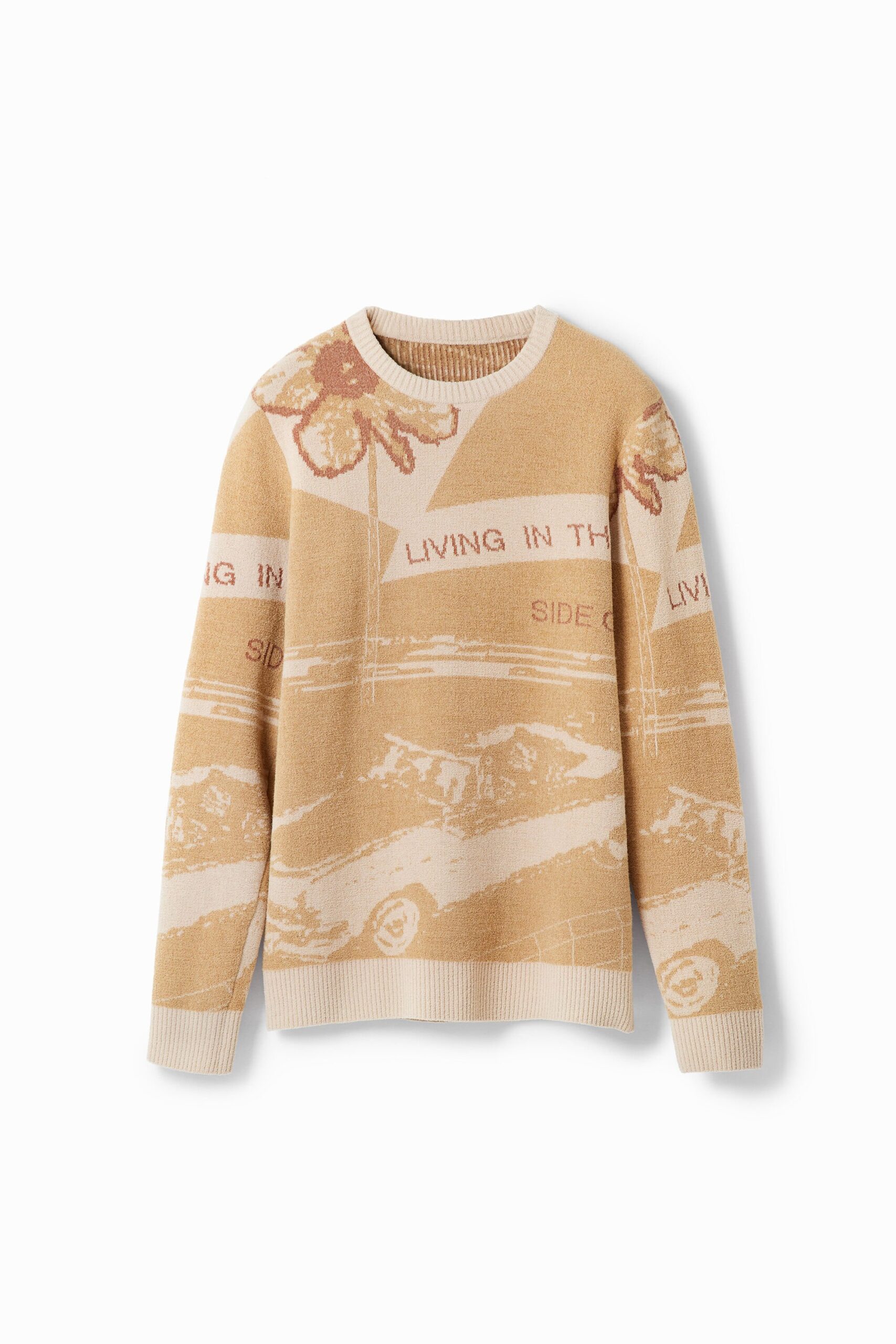 Jacquard gebreide trui met ronde hals en krantenprint.