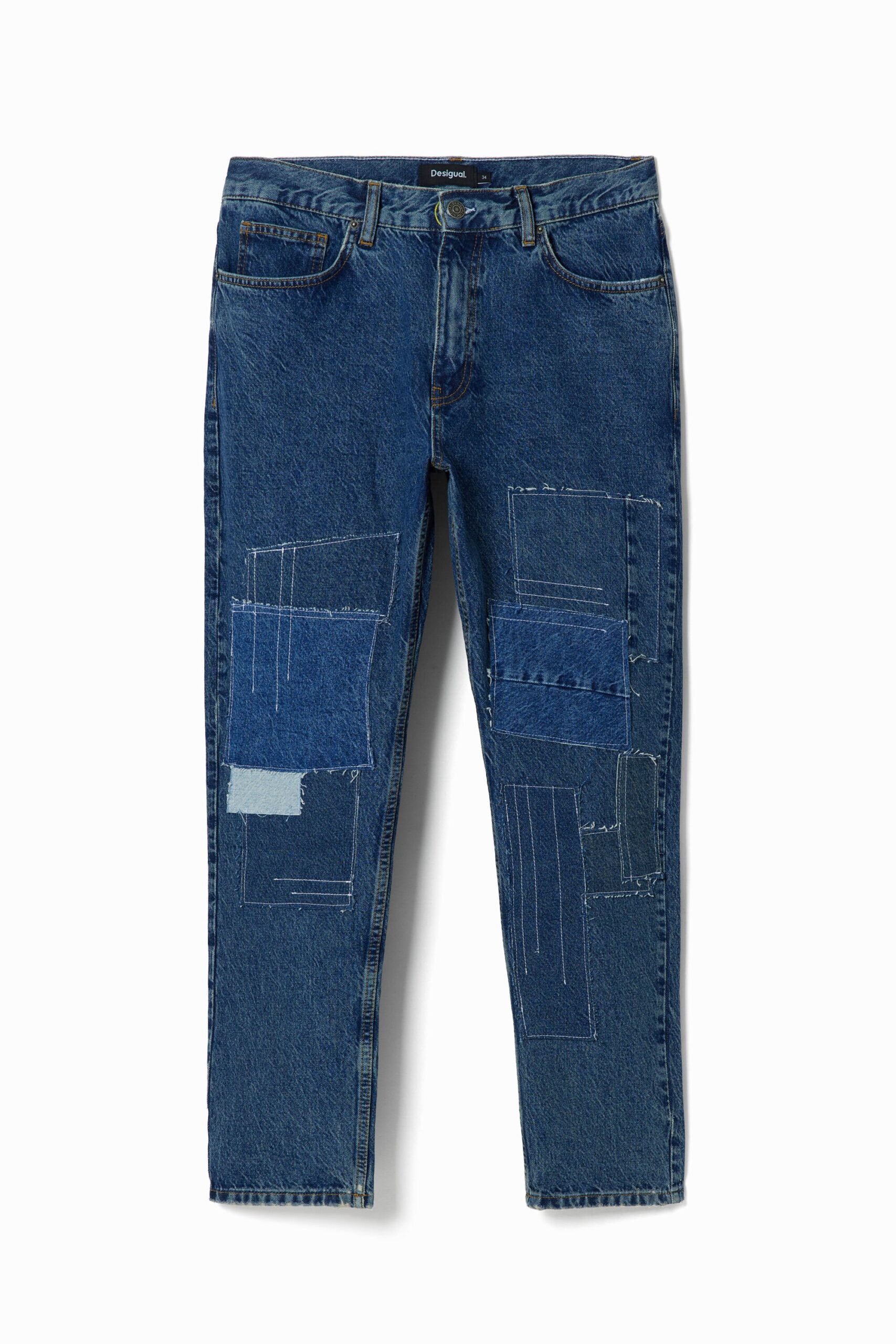Carrot-fit jeans with a washed effect and patches in different shades with contrasting stitching and a frayed finish.