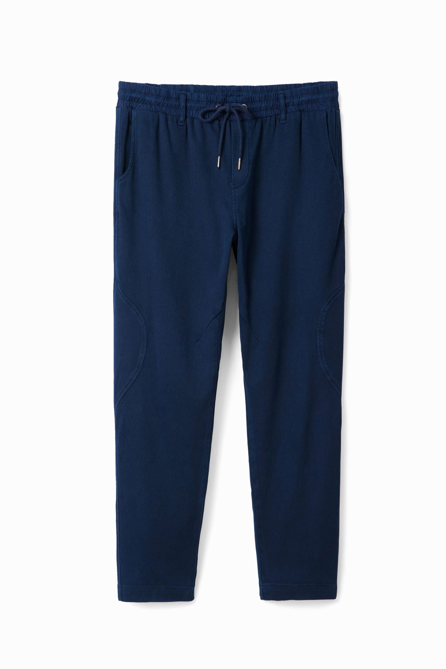 Joggingbroek met elastische taille en boorden, trekkoord en decoratieve naden op de pijpen.
