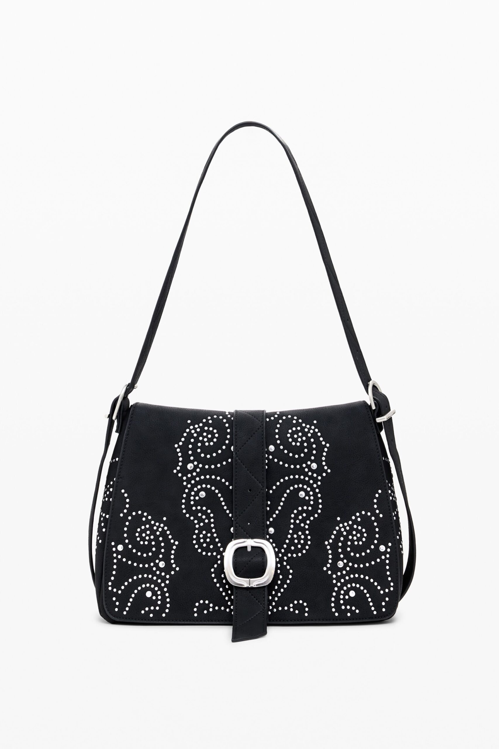 Schoudertas in leerlook stof, effen kleur, met metalen studs, verstelbare riem en ritssluiting.