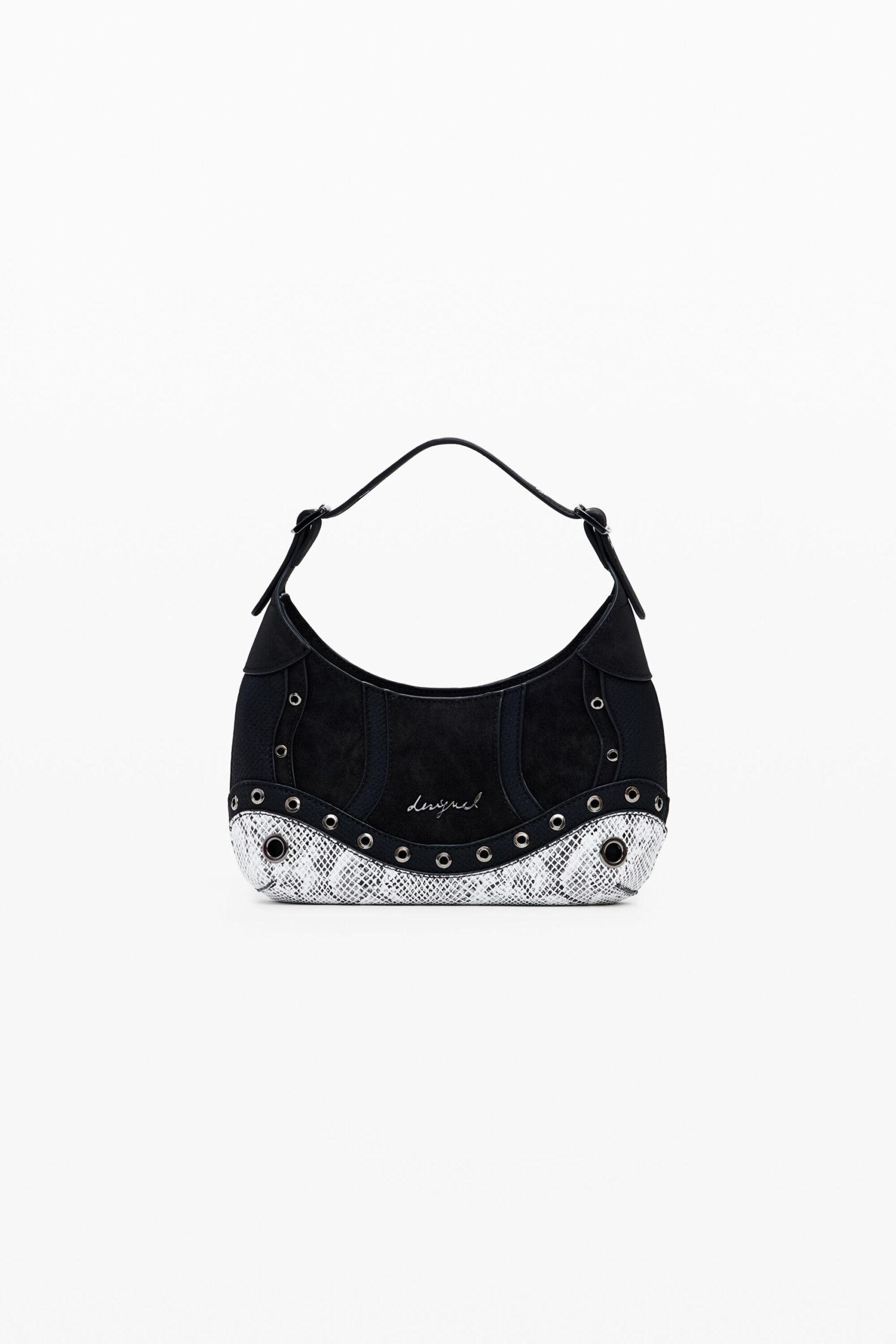 Kleine schoudertas met een combinatie van stoffen, slangeffect, metalen studs, verwisselbare handvatten en ritssluiting.
