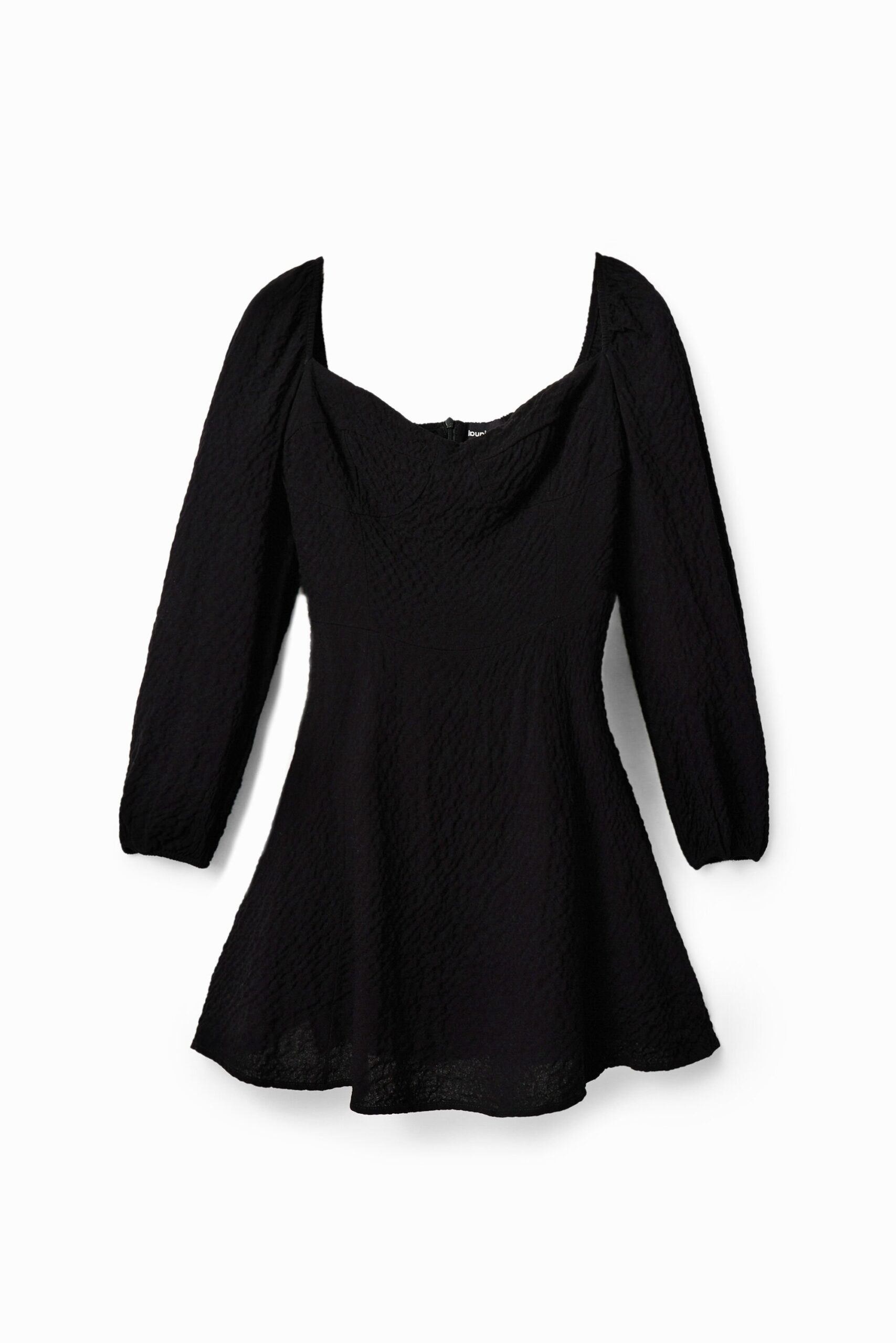 Korte jurk met lange pofmouwen, aansluitend lijfje met cups en wijd uitlopende rok. Structuurstof met kreukeleffect.