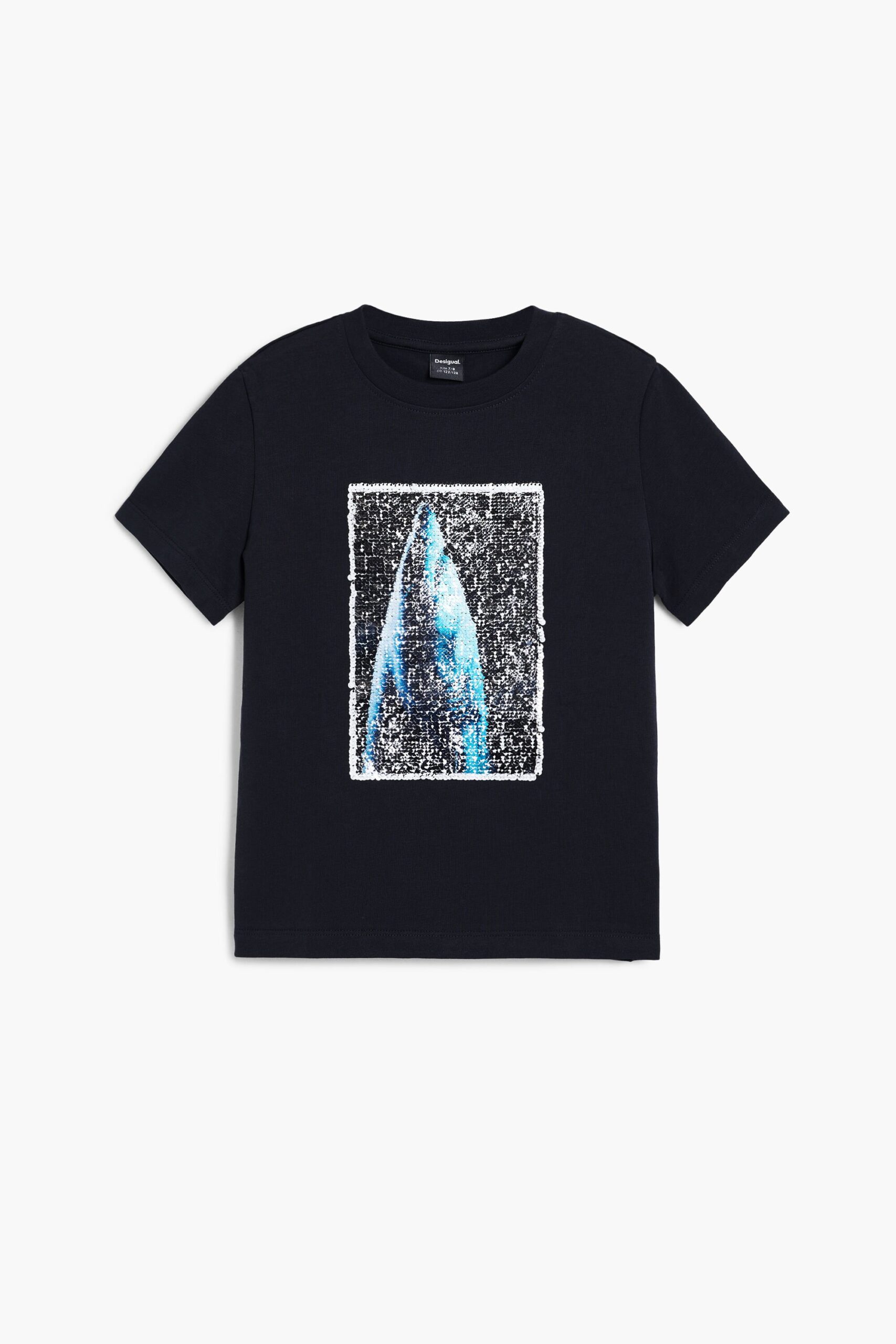 Kort mouw T-shirt met omkeerbare pailletten waarmee het ontwerp kan worden getransformeerd, waarbij verschillende zeedieren worden getoond.