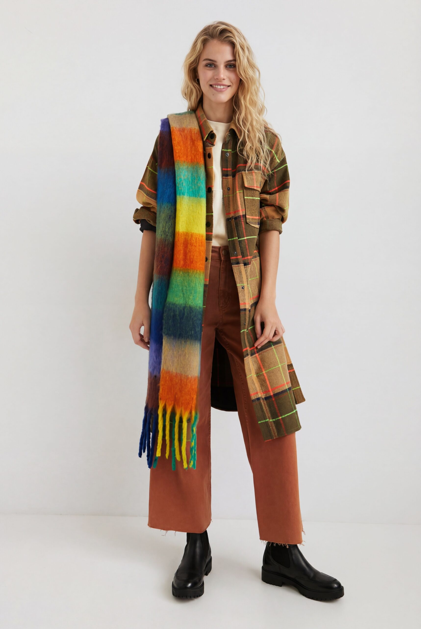 De klassieke Schotse ruit… maar dan met fluorescerende kleuraccenten. Zó leuk: een lange stoffen jas met een overhemdpasvorm, drukknoopsluiting en verstelbare ceintuur in de taille.