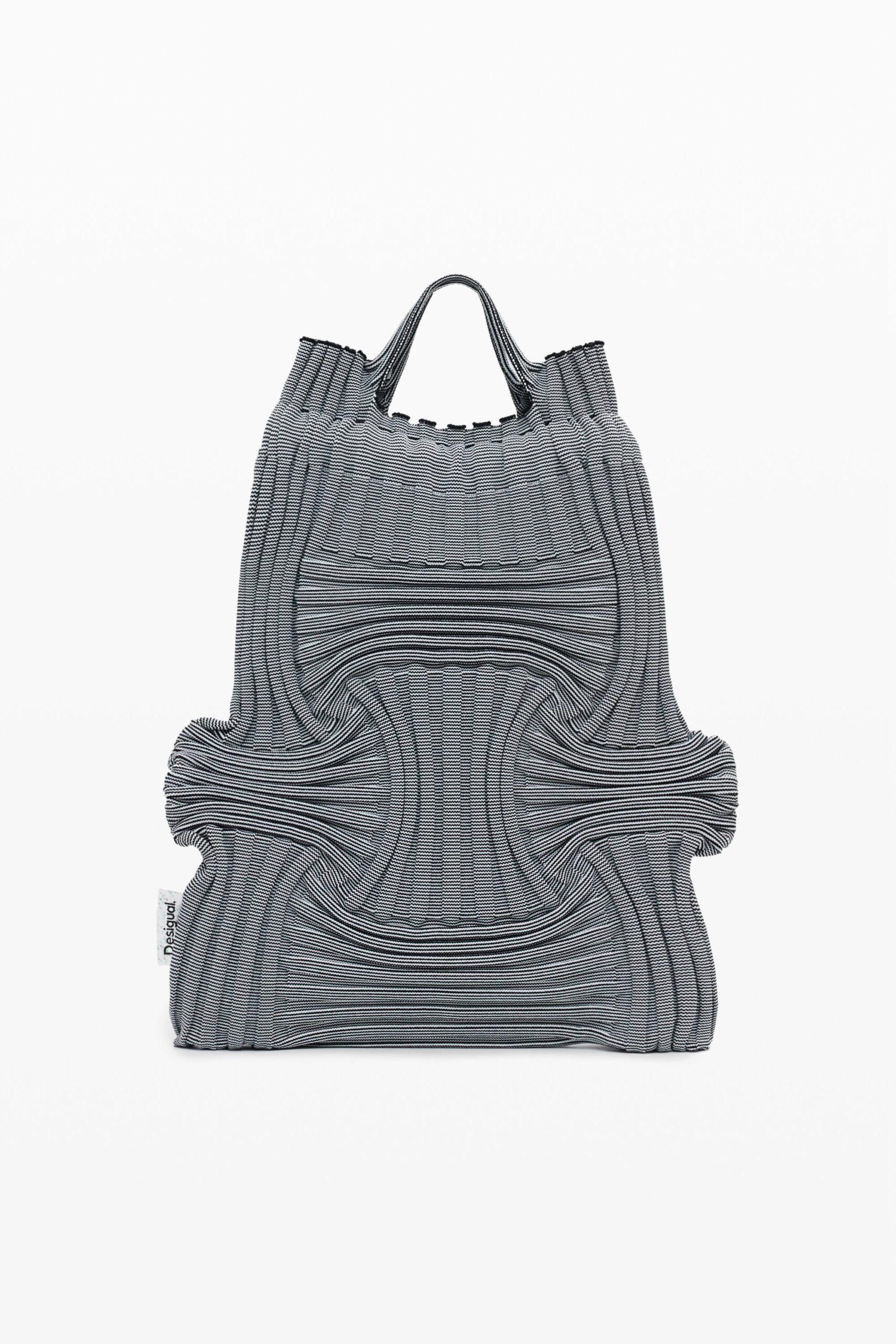 Middelgrote rugzak met reliëfontwerp en flexibele structuur, gemaakt van rekbare breistof met hoge aanpasbaarheid.