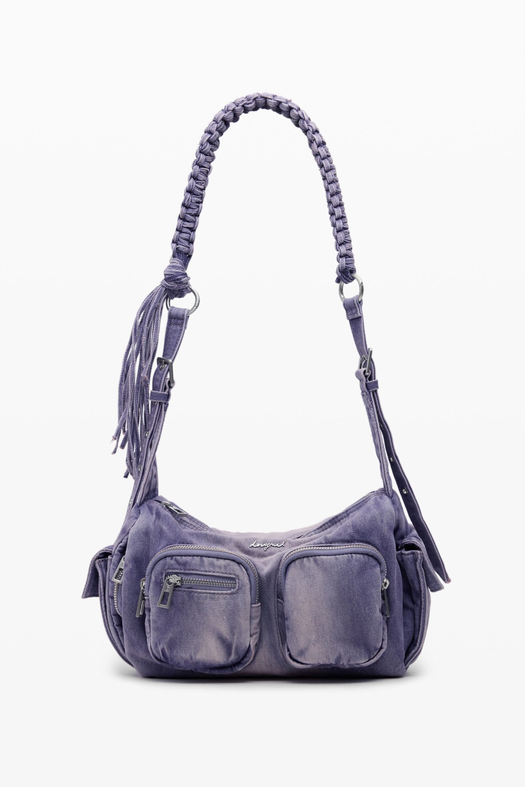 Middelgrote crossbodytas van denim-effect, met voor- en zijzakken, verstelbare band en decoratieve stiksels.