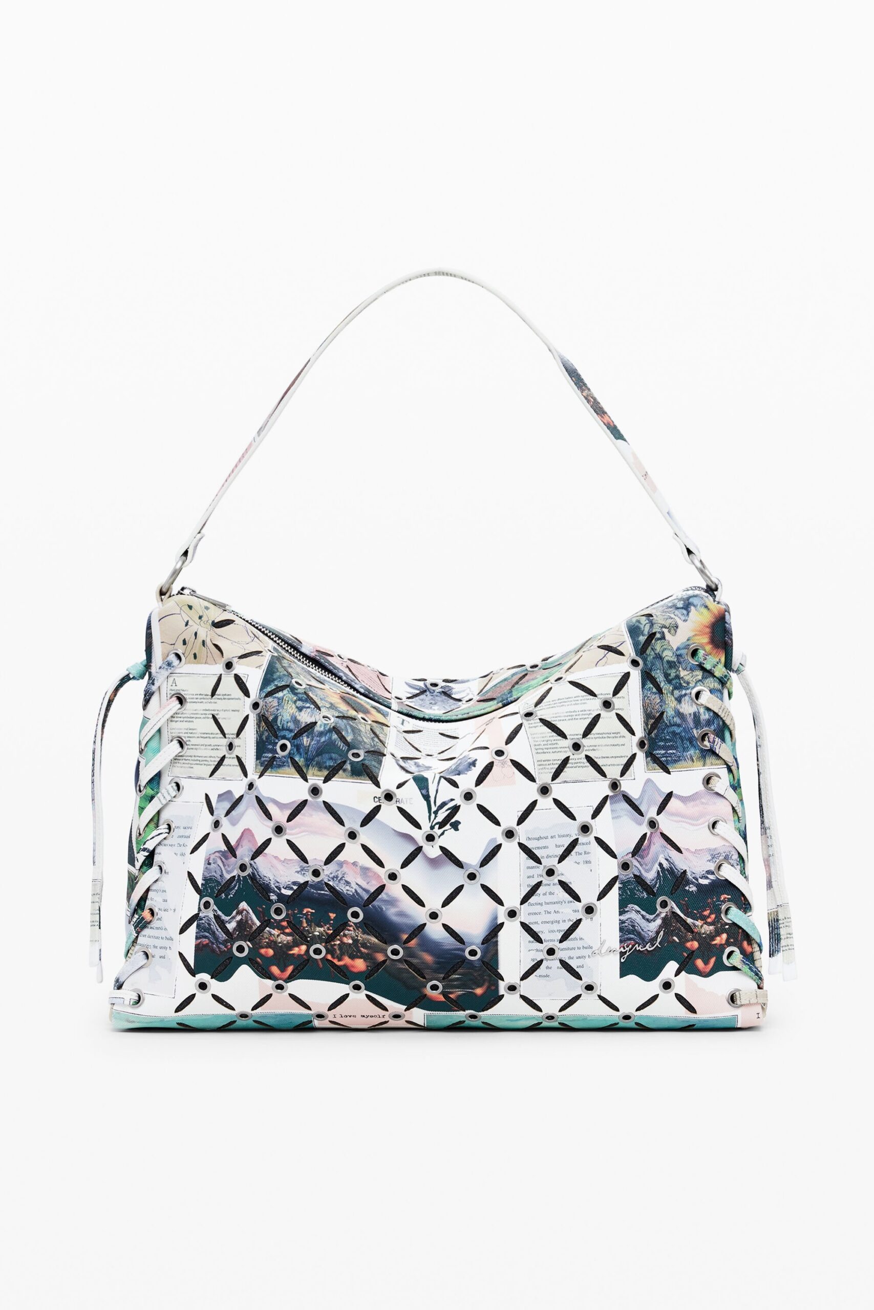 Schoudertas van gemiddelde grootte, met geperforeerde stof, Collage-stijl print, zijvlecht details en verwisselbare handvatten.