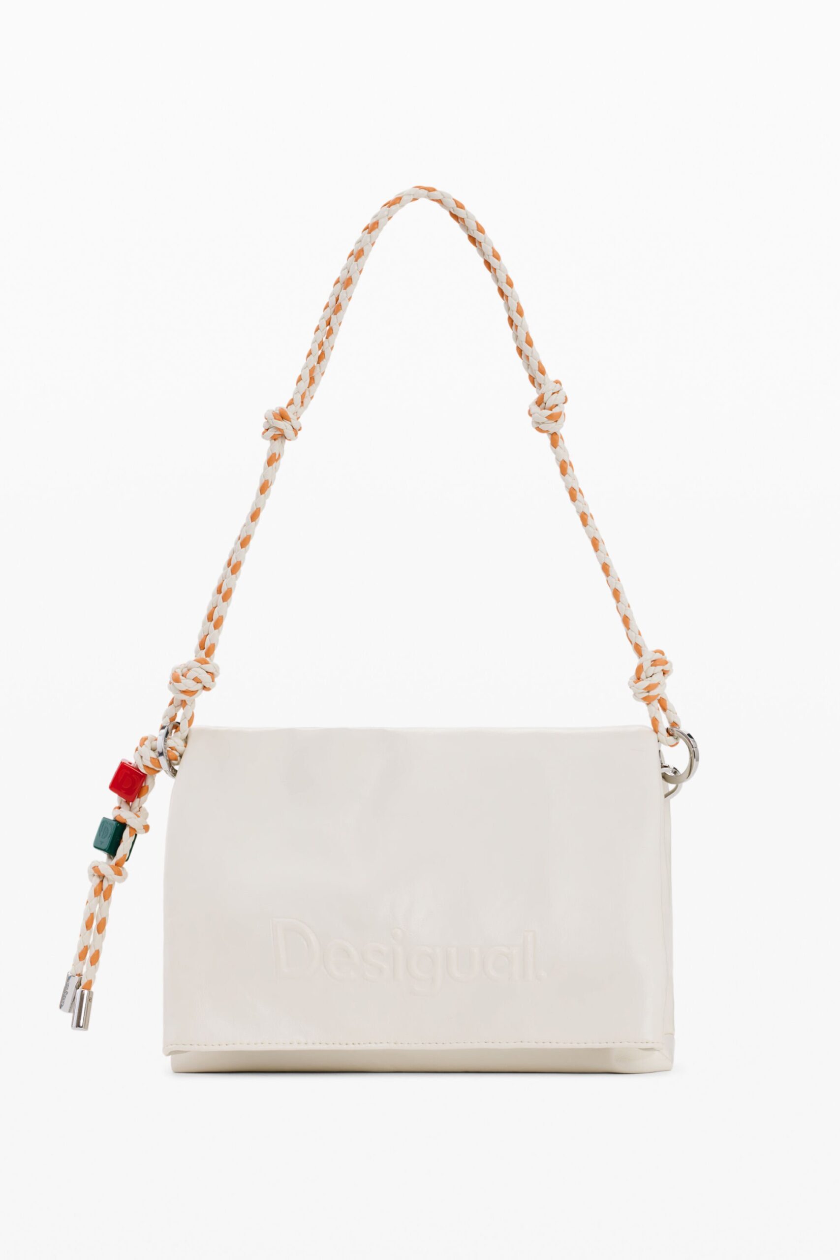 Middelhoge schoudertas in lederlook met verwisselbare riemen, charms met kaarthouder en ingegraveerd logo in dezelfde tint.