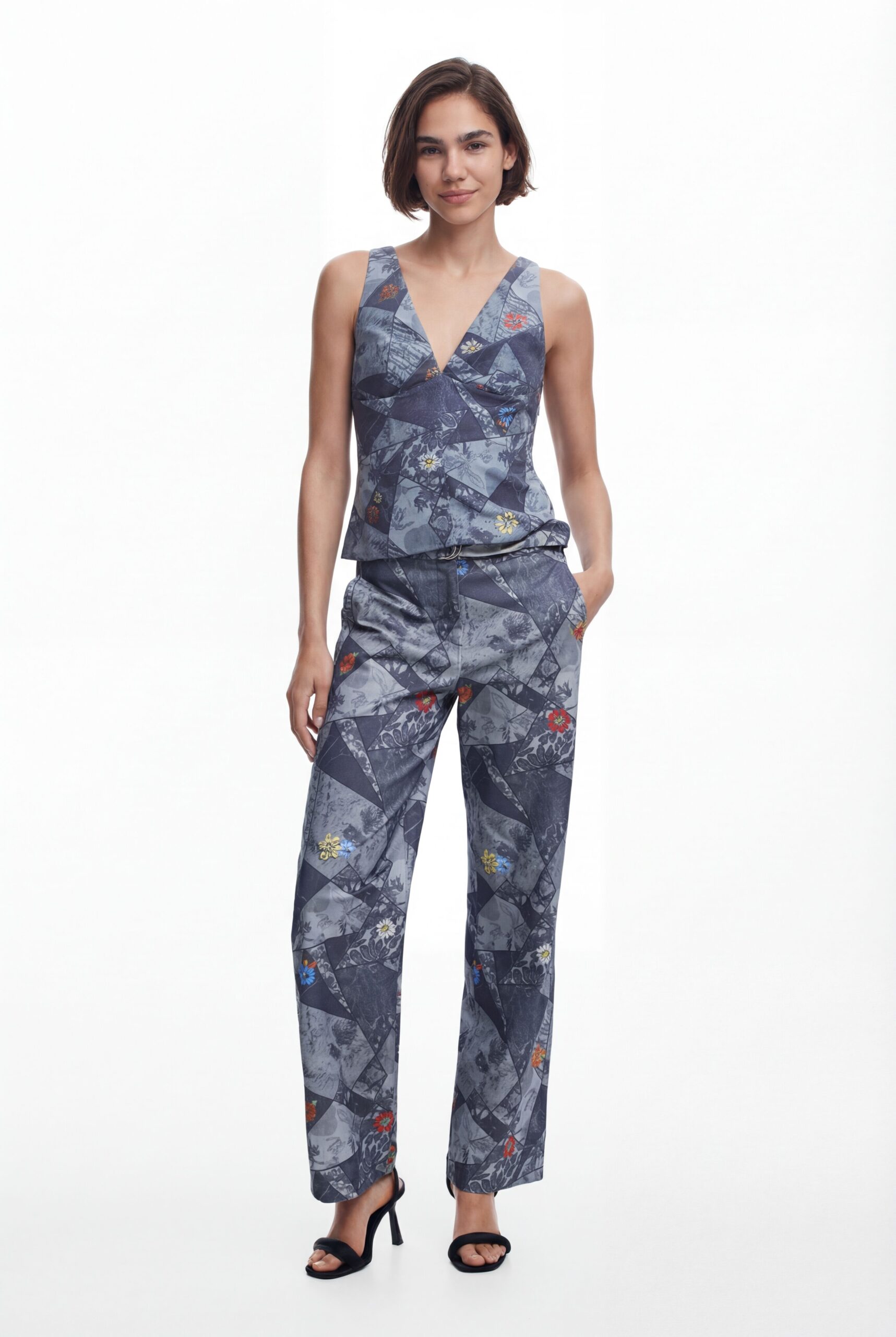 Lange broek met rechte snit met een patchworkdesign met bloemendetails.