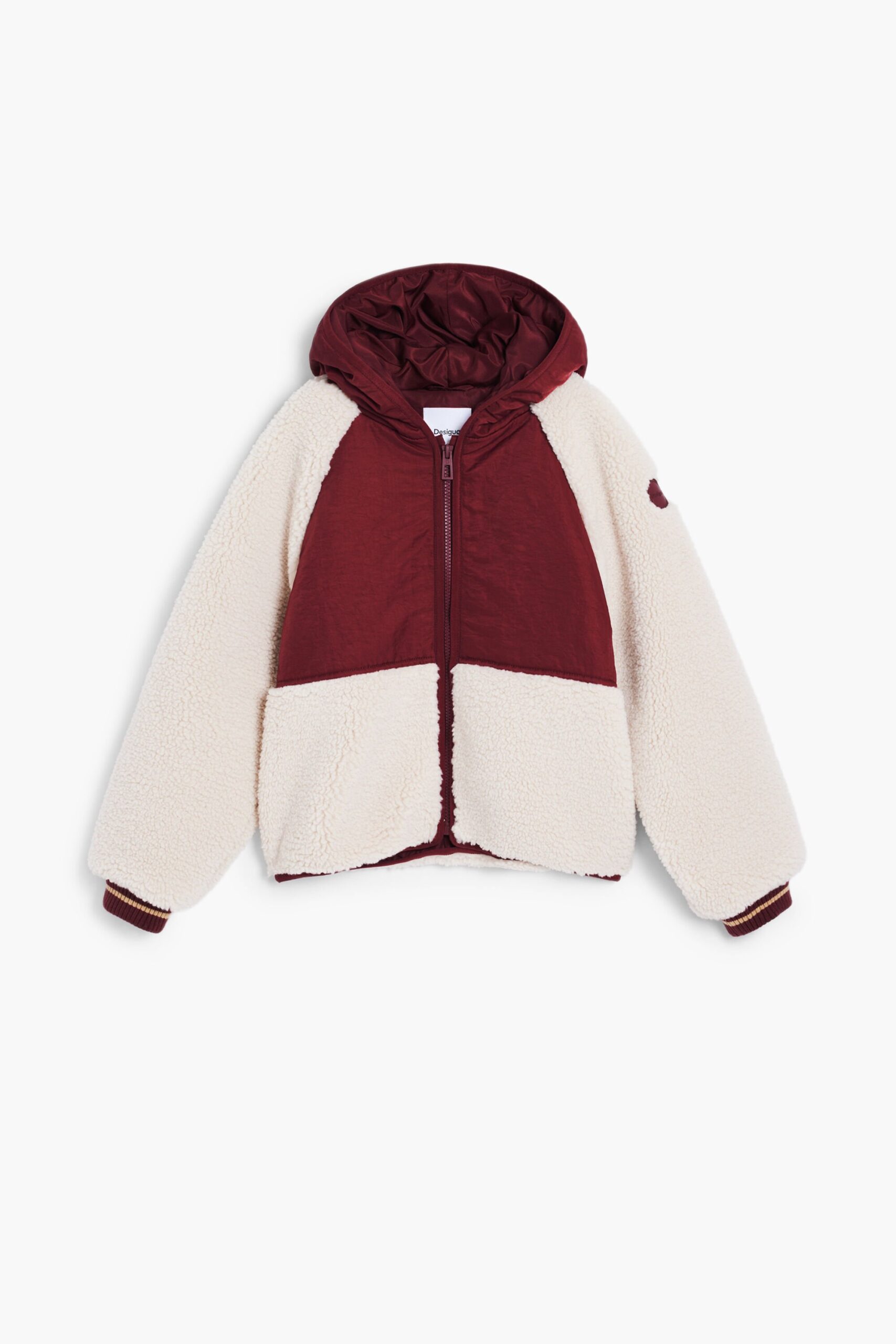 Regular-fit jas met capuchon, gecombineerd met sweatshirt- en teddy-stijl stoffen.