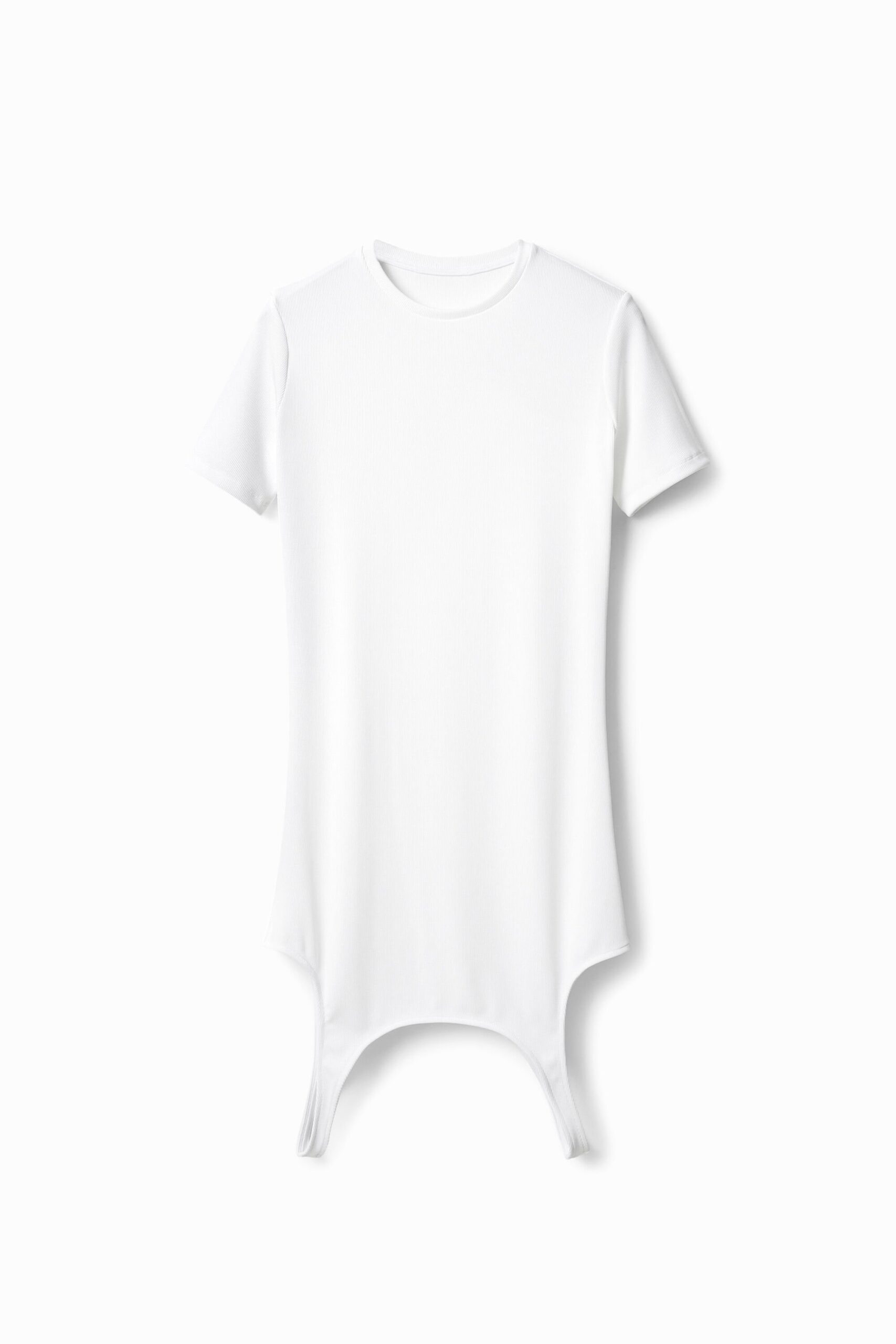 Ofwel draag je dit T-shirt met korte mouwen in ribstof als een jurk, ofwel vouw je het dubbel en draag je het als een dubbellaags T-shirt. Ontworpen door Maitrepierre.