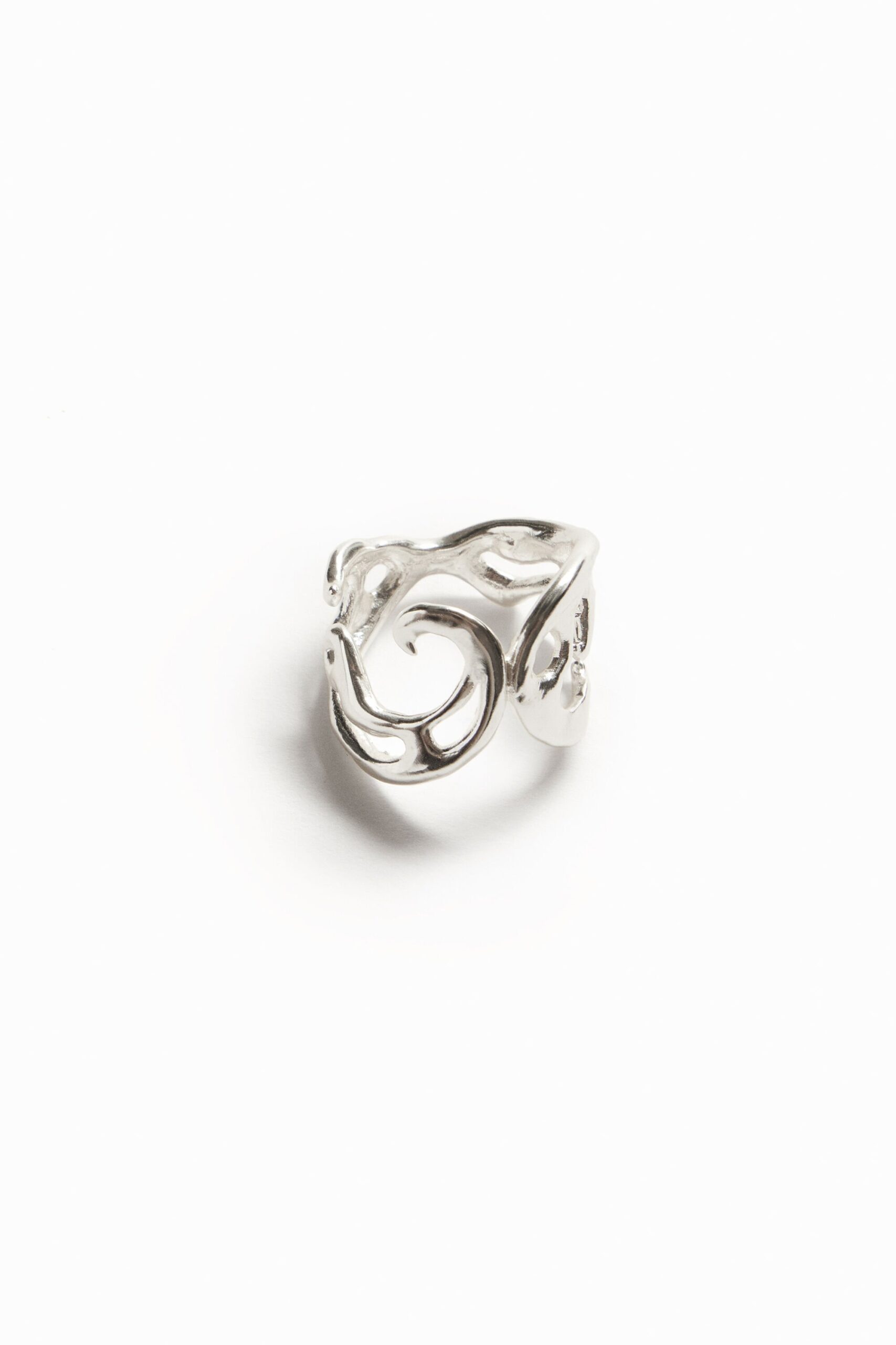 1e gehalte verzilverde ring van 3 microinch met organische vormen en een handgevormd effect. Ontworpen door Gala Meyer.